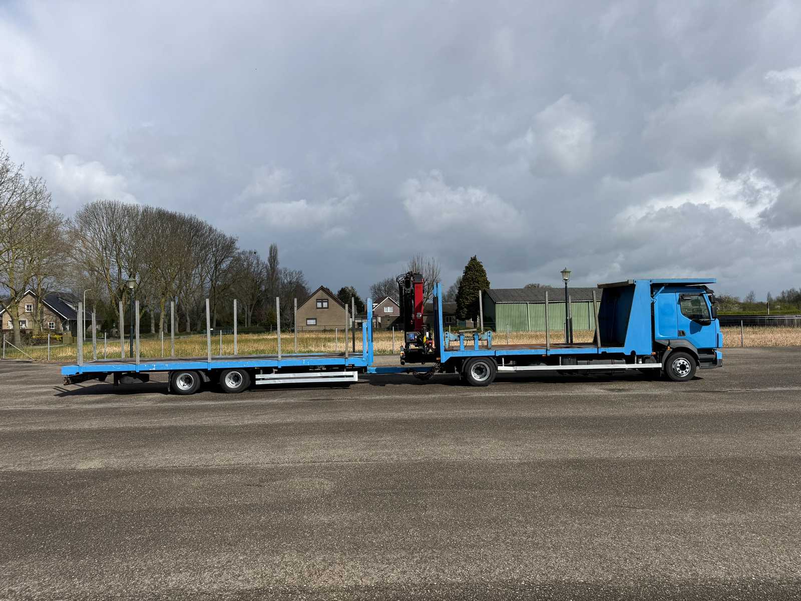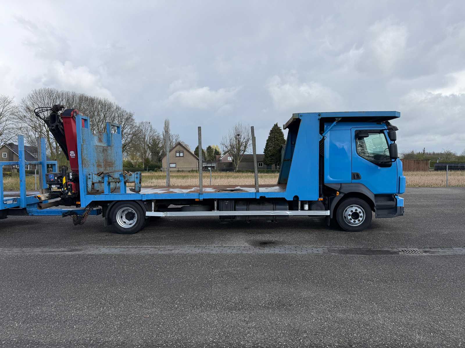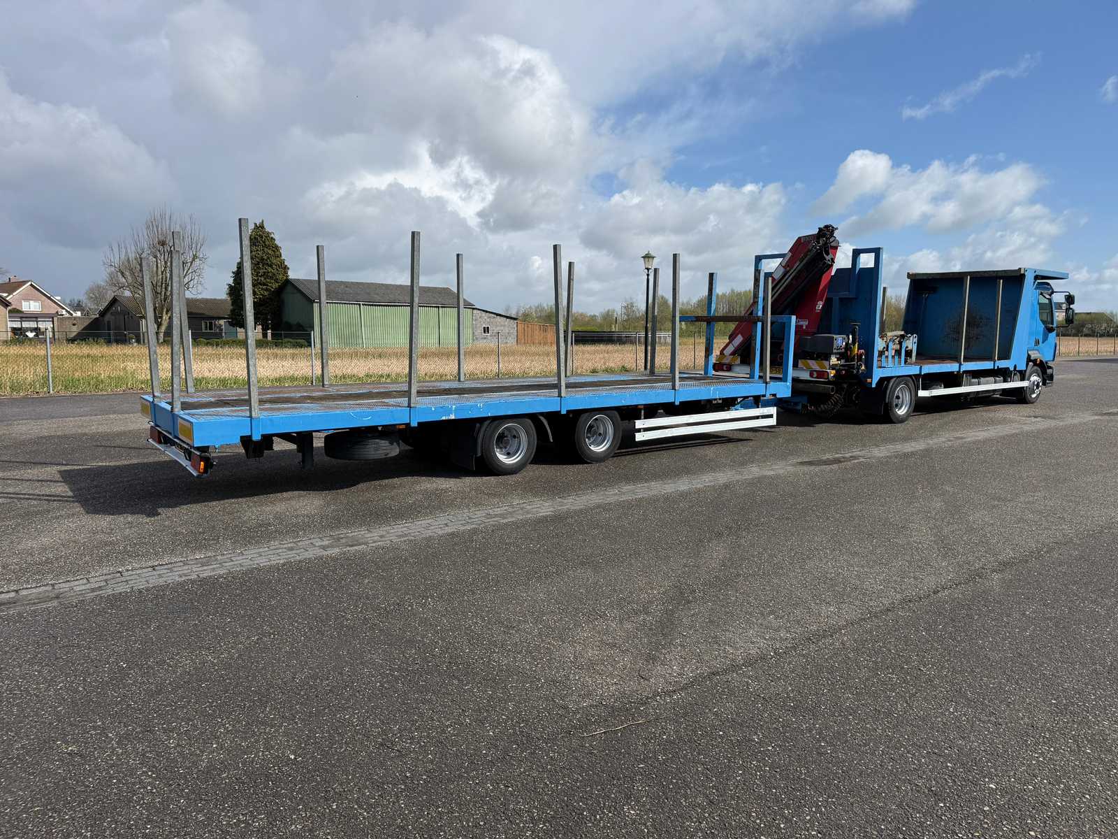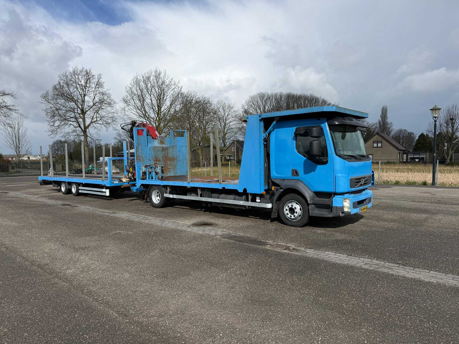| Description | Equipped with: HMF 1300 Truck-mounted crane with 2x hydraulic support legs, (HMF 1300 K2, Year of Construction 2010, 2x extendable with rotator), 6 holes with four stanchions on box truck, 12x stanchions with holes on trailer, grab clamp for the crane (suitable for cars to clamp), double tank, storage boxes side, BPW Axles on trailer, engine brake |
