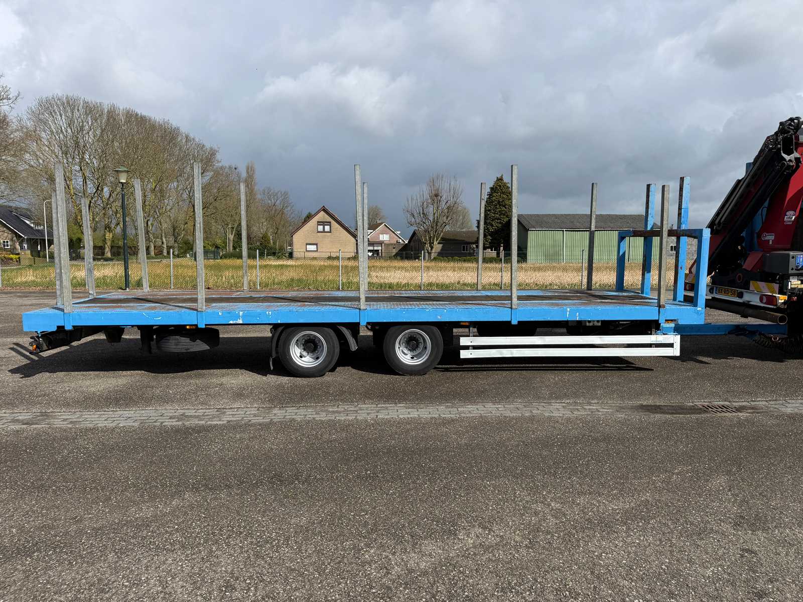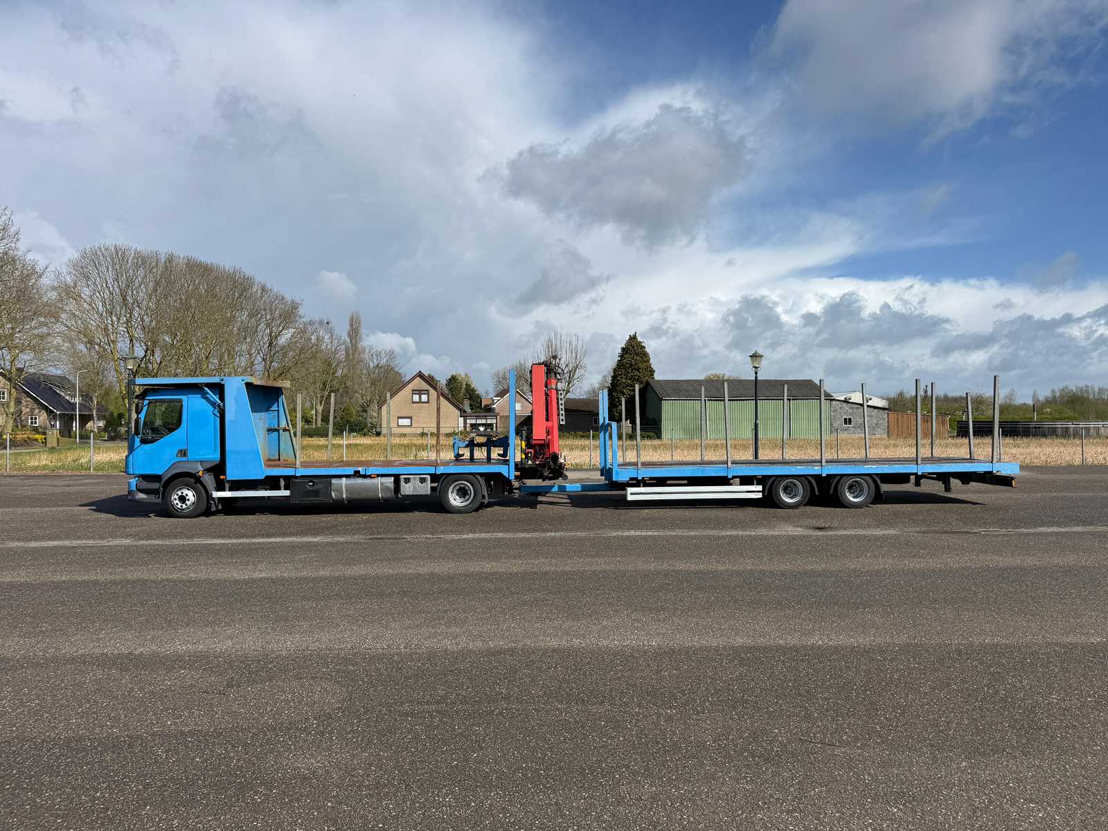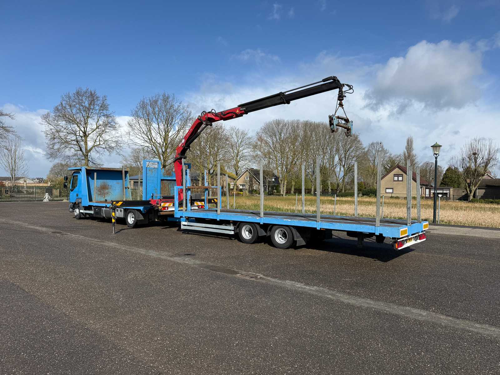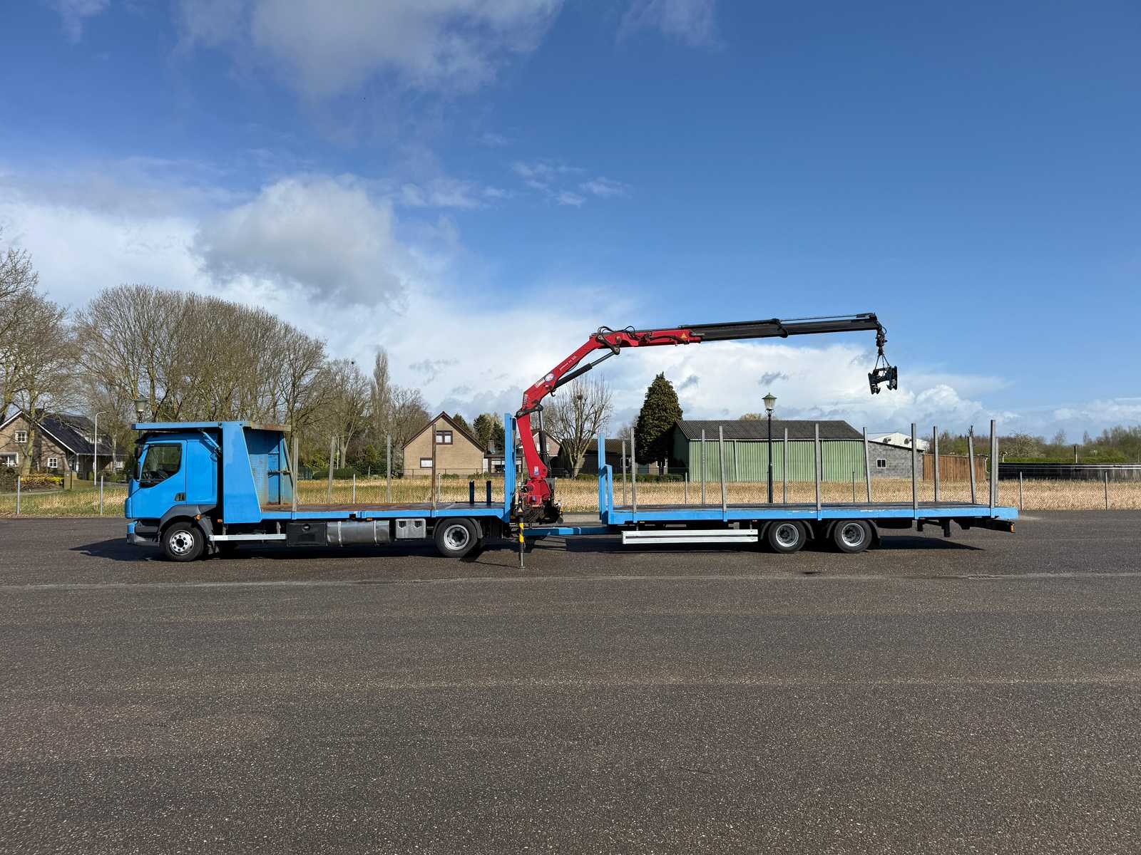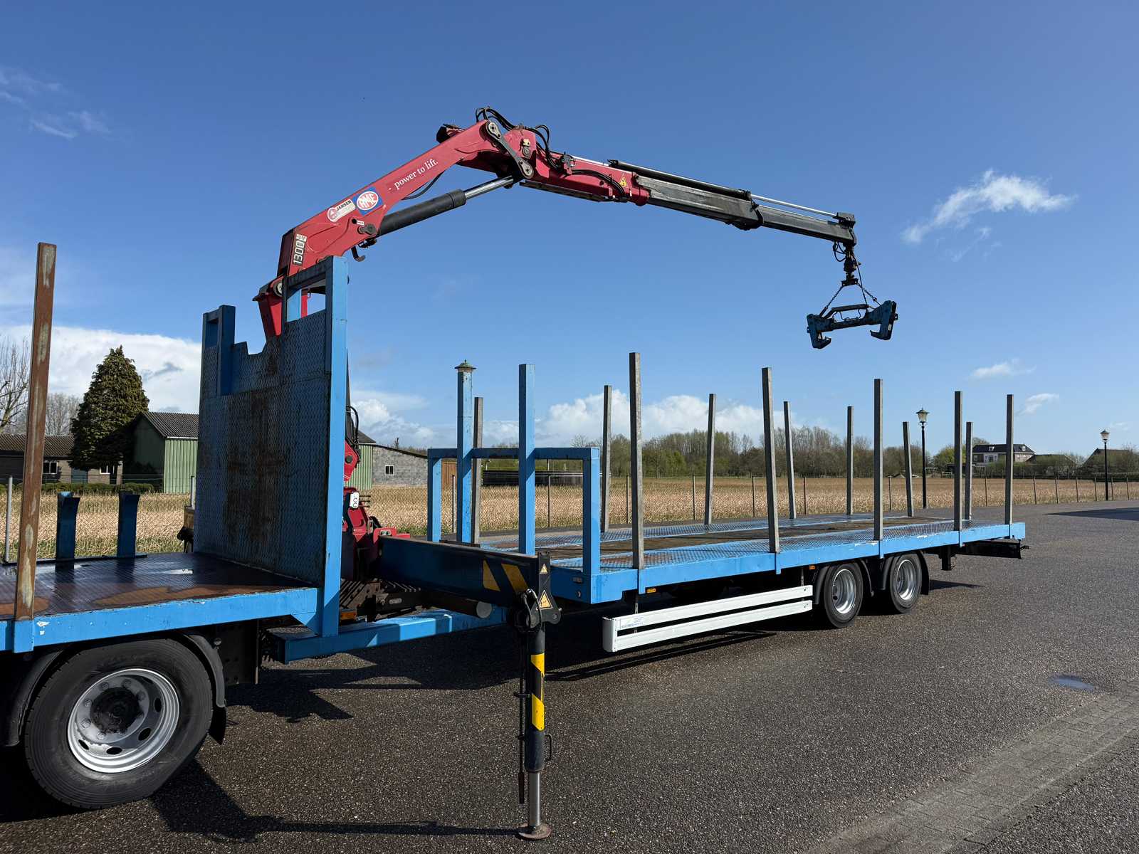 | Description | Equipped with: HMF 1300 Truck-mounted crane with 2x hydraulic support legs, (HMF 1300 K2, Year of Construction 2010, 2x extendable with rotator), 6 holes with four stanchions on box truck, 12x stanchions with holes on trailer, grab clamp for the crane (suitable for cars to clamp), double tank, storage boxes side, BPW Axles on trailer, engine brake |