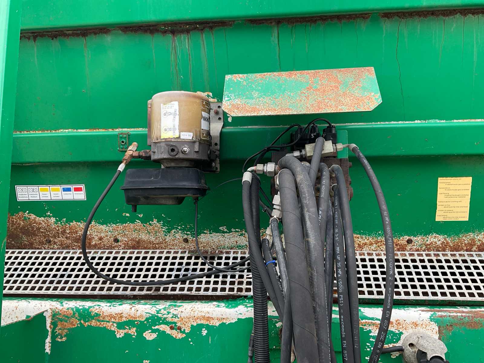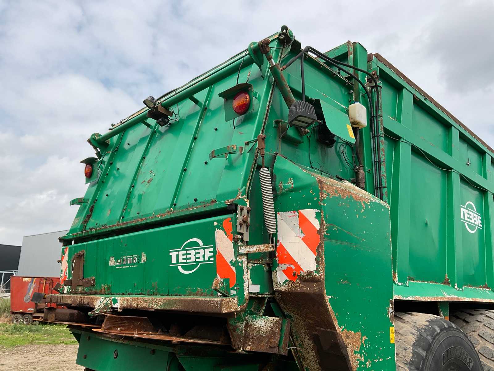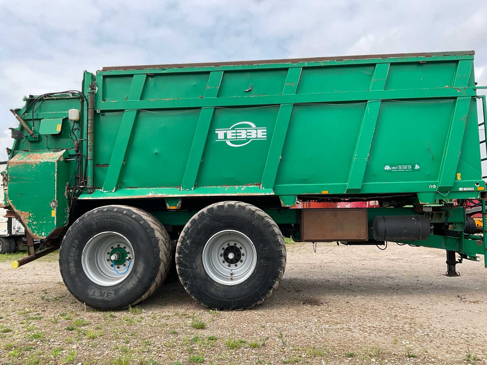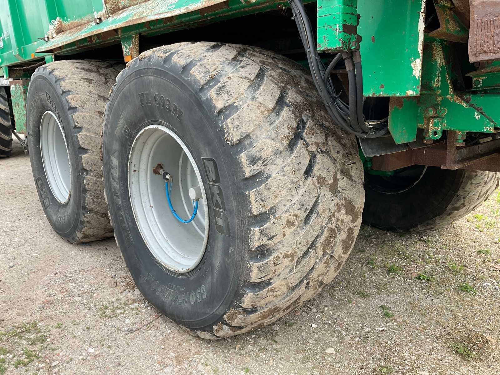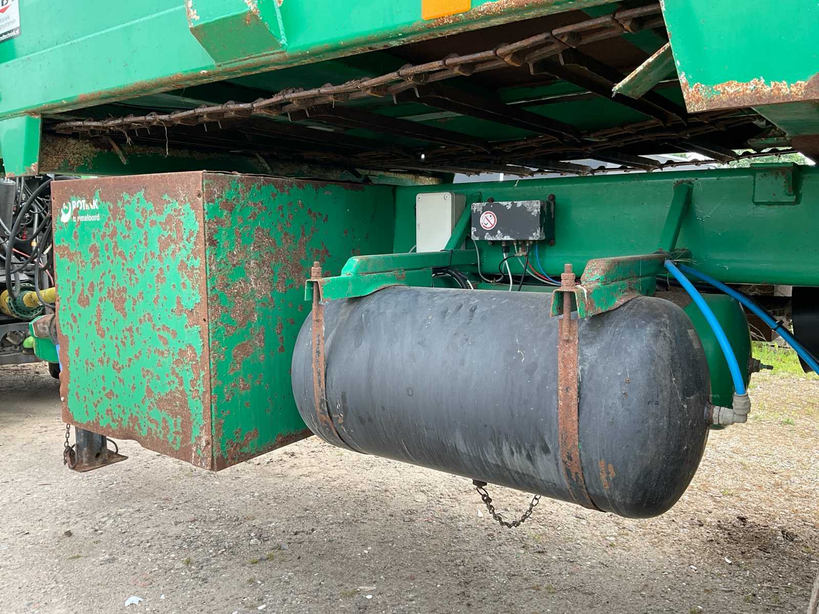 | Description | equipped with: electro-hydraulic control (load-sensing), MDT tuned weighing system, air pressure change system, speed monitoring, hydraulically forced steered rear axle, K80 hitch, automatic lubrication system, mechanical support leg, air brakes, suspension drawbar, hydraulic suspension, front lift axle, PTO driven spreading discs, hydraulic tailgate, hydraulic dosing slide, plastic bumpers, rear tow bar, scraper floor (HV100 heavy type replaced) (steering cylinder left rear defective, now fixed) |