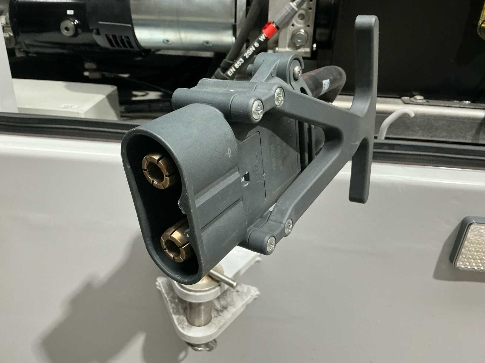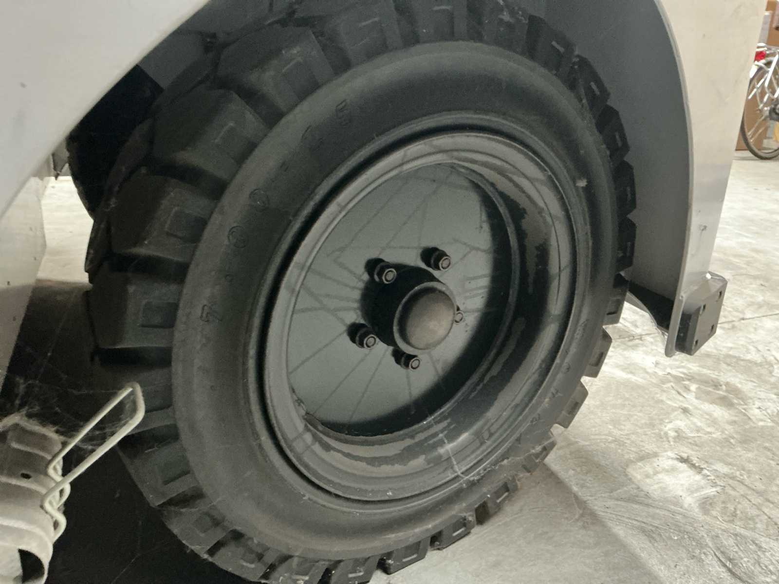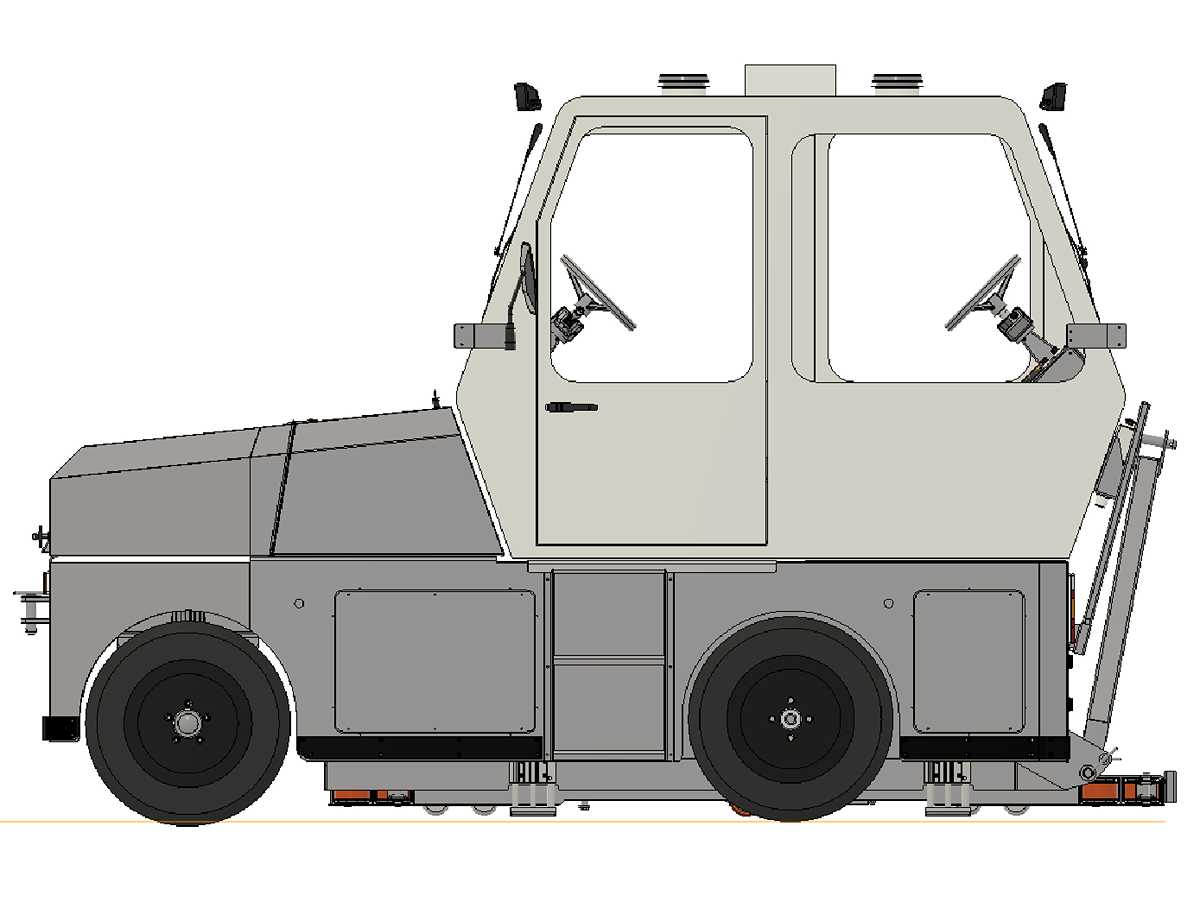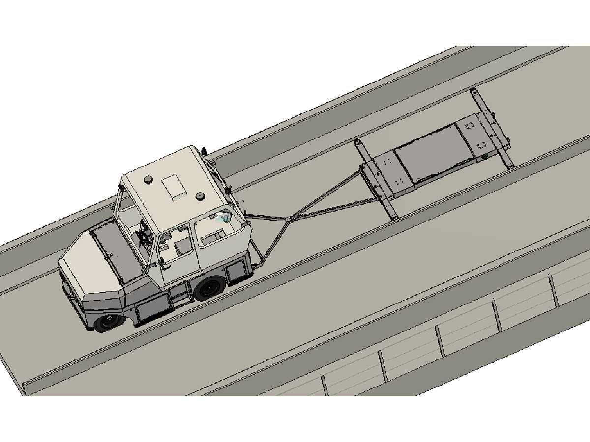 This vehicle was specially designed for the a middle-east company application, meaning due to the barriers along the small lane width of that elevated track a stranded GRT could not be approached sideways. The salvage vehicle for that reason required to be bi-directional as it have to drive “backwards” towards the GRT, deploy the lifting platform (carried under the salvage vehicle) and connect to the salvage vehicle and drive “forward” towing the GRT on the platform. The lifting platform has guidance wheels in order to prevent the GRT on the platform being damaged by the (concrete) barriers along the track. The guidance wheels follow the curvature of those barriers.
