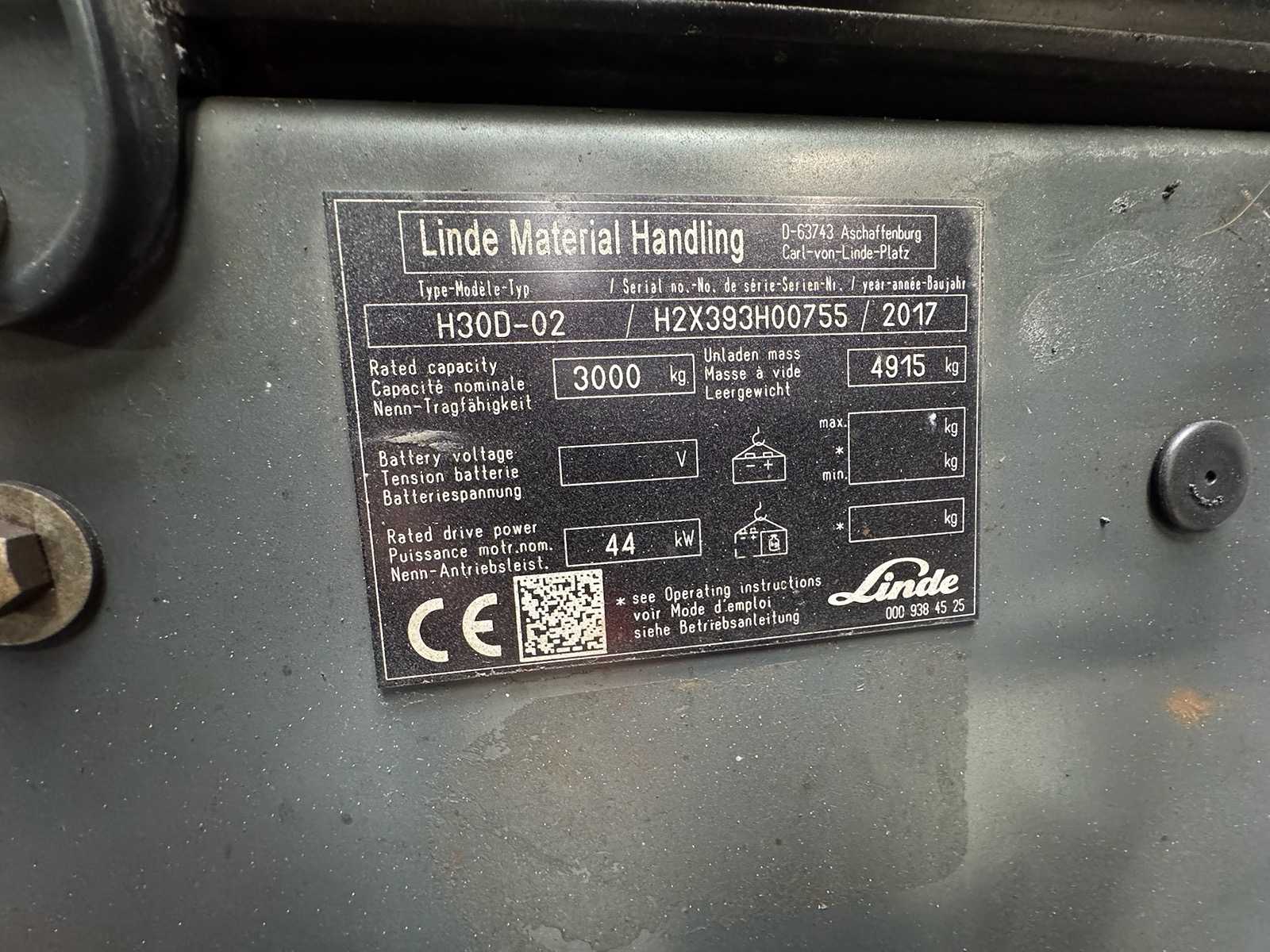 2017 UVV 03/2027 Linde H30D-02 EVO 3,000kg Duplex 495cm 4th Valve Diesel Forklift Forklift 7,128 Hours