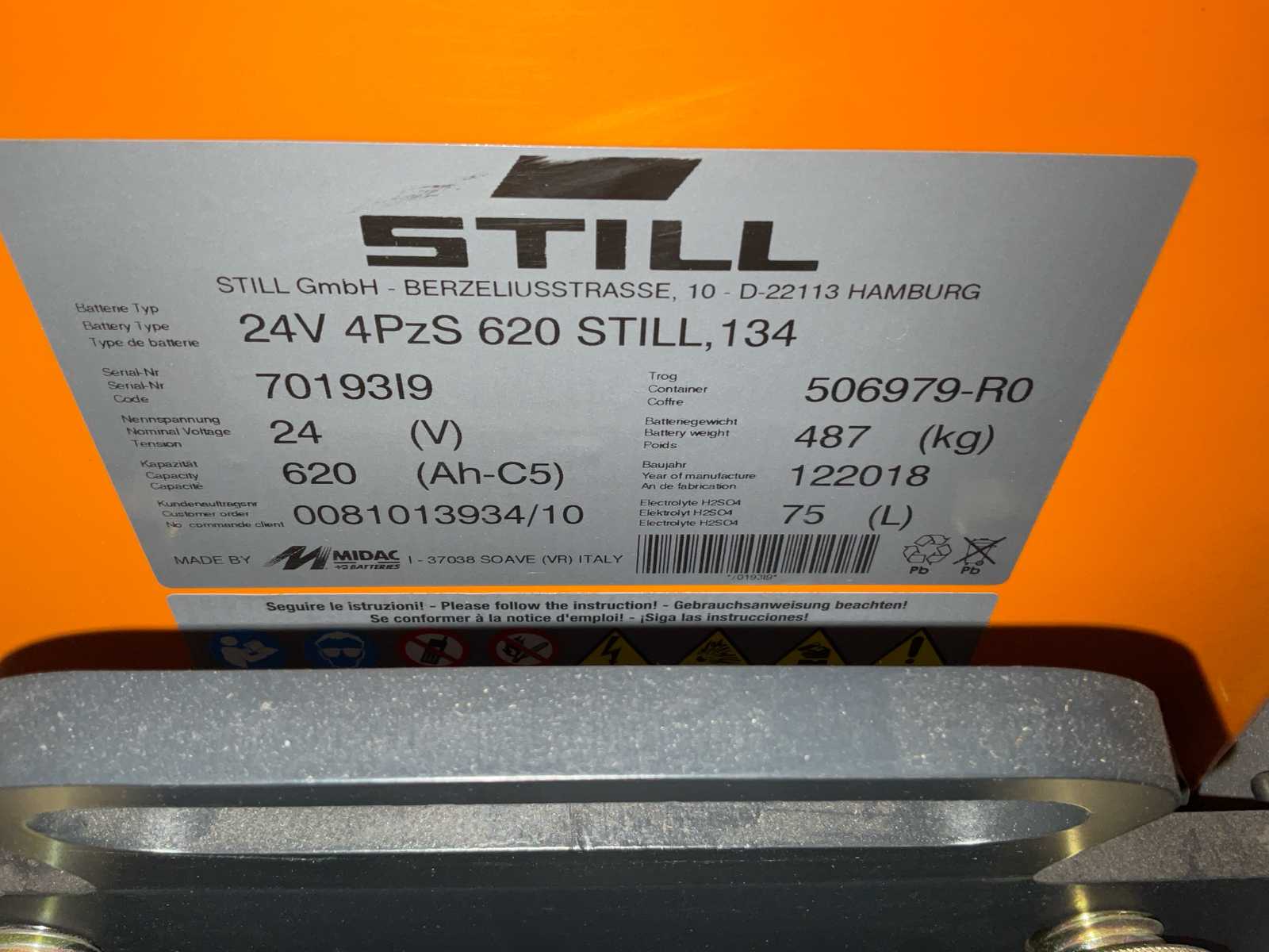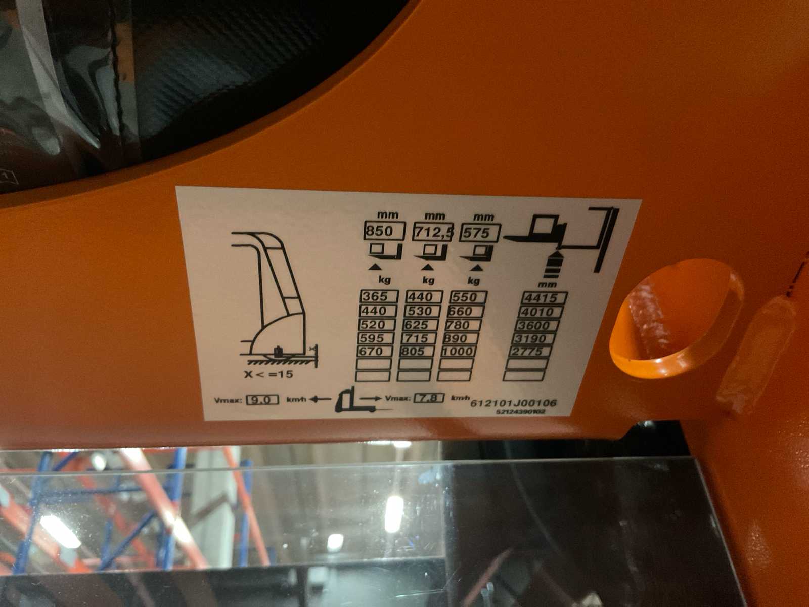 | Description | lifting height 4415 mm, lifting capacity 1000 kg, forklength 1150 mm, free height 2350 mm, with charger |