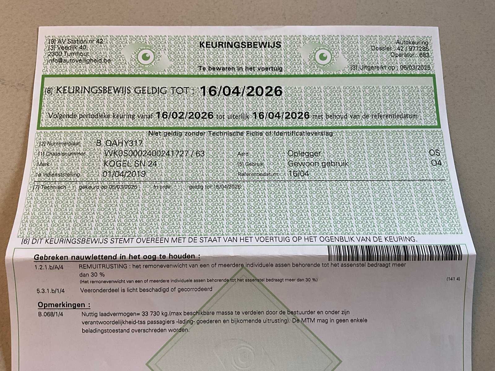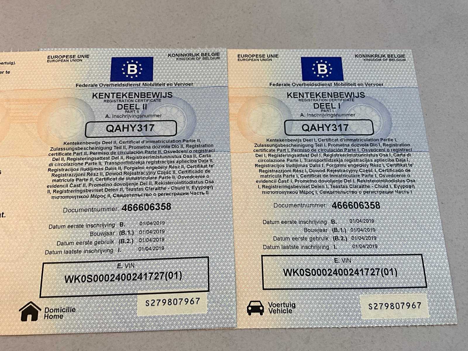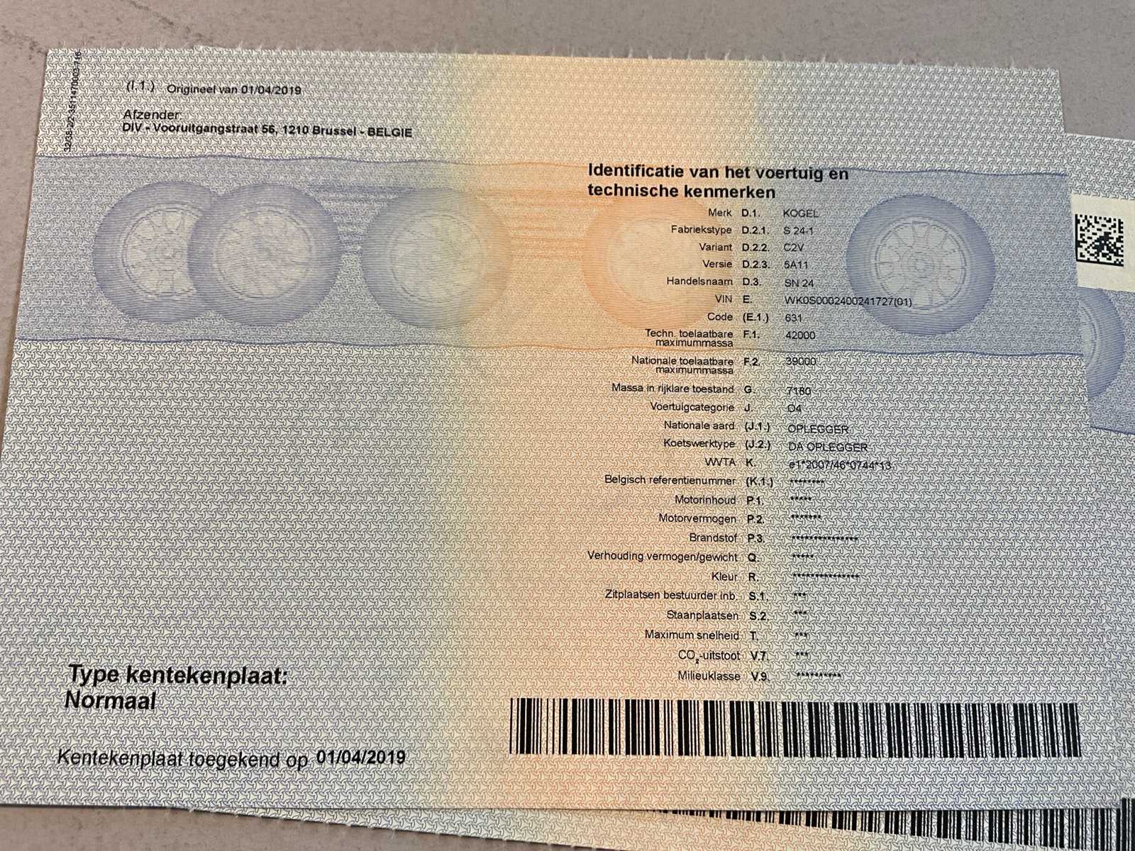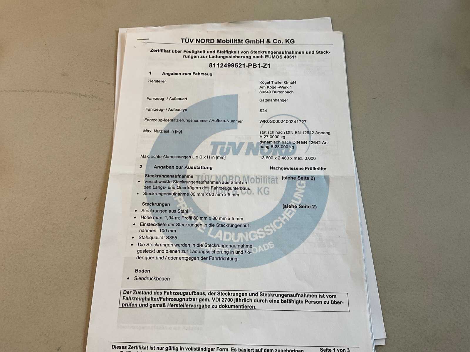 Documents present: Registration certificate part I, Registration certificate part II, Identification report, Certificate of conformity, Inspection certificate, TÜV Nord certificate.