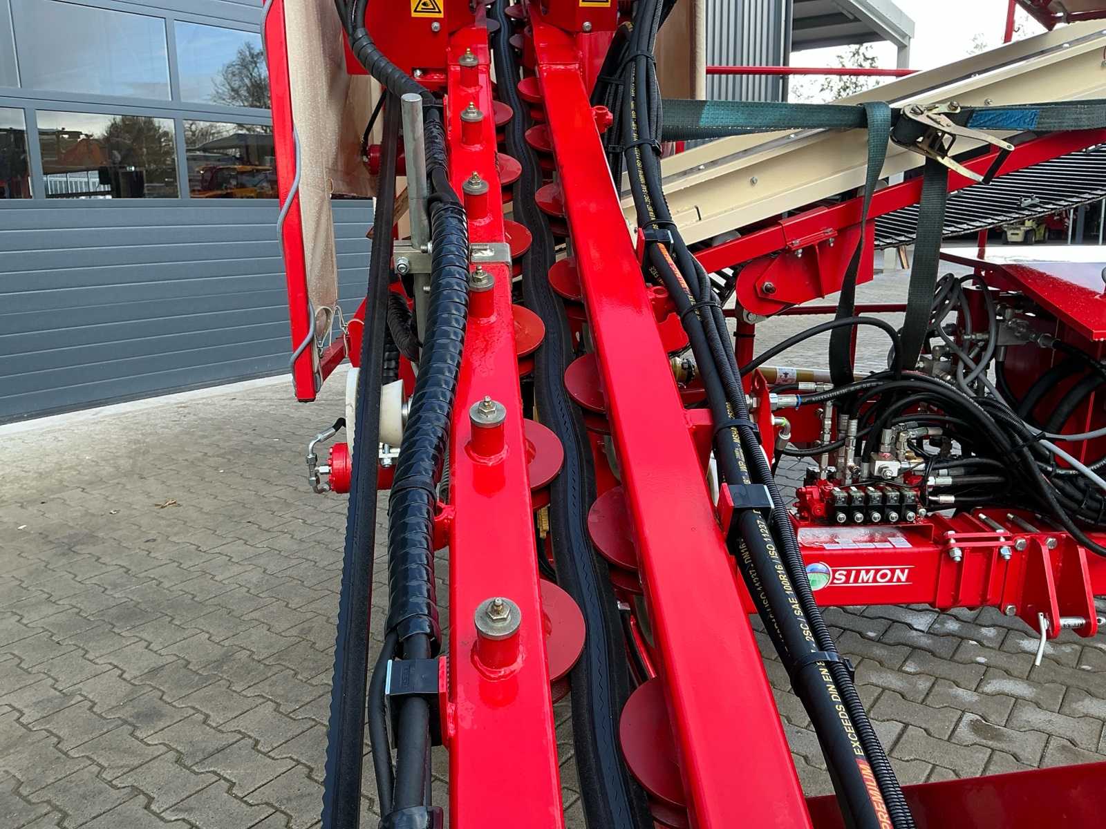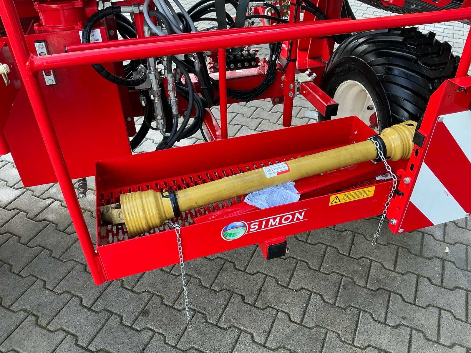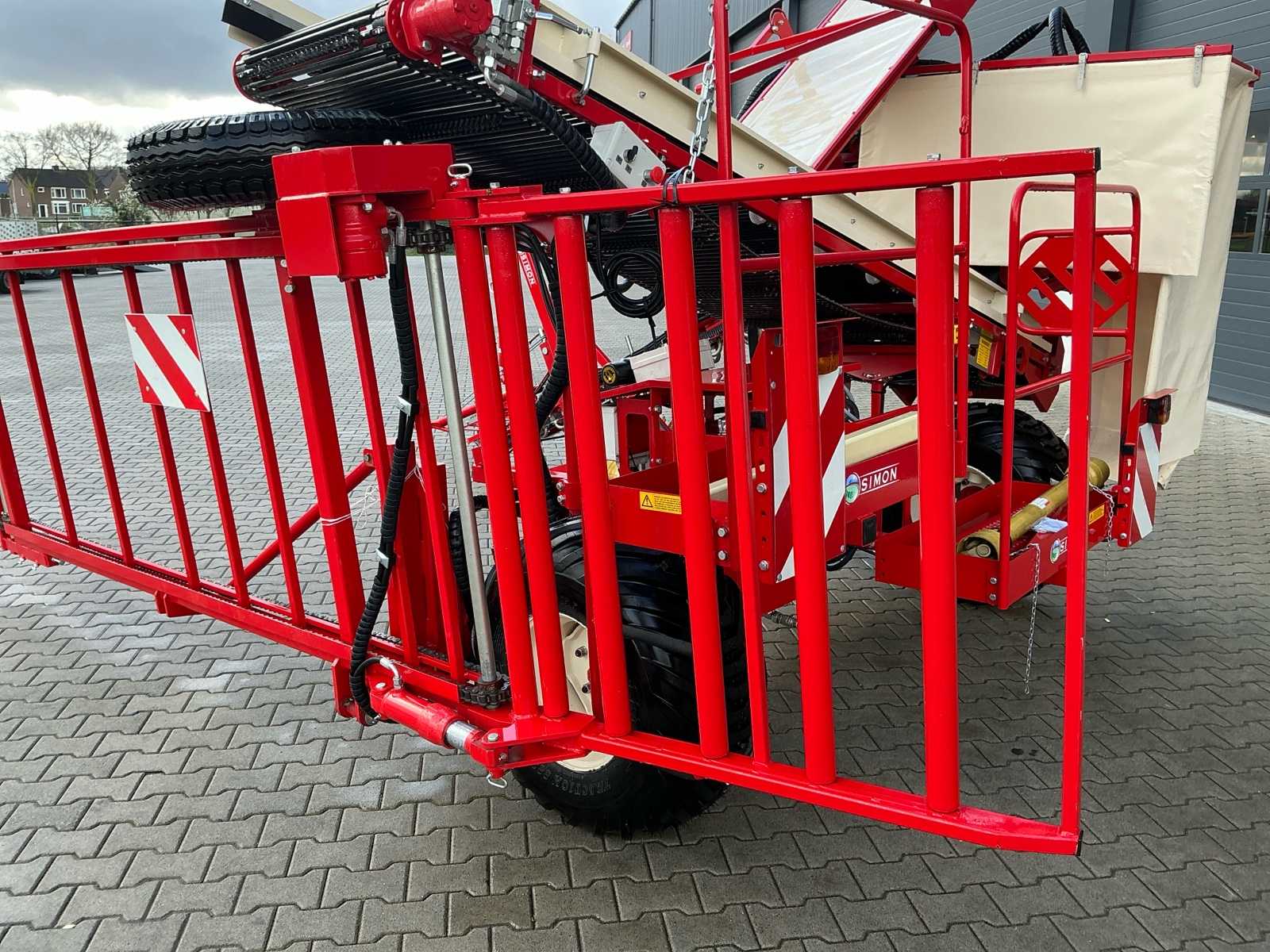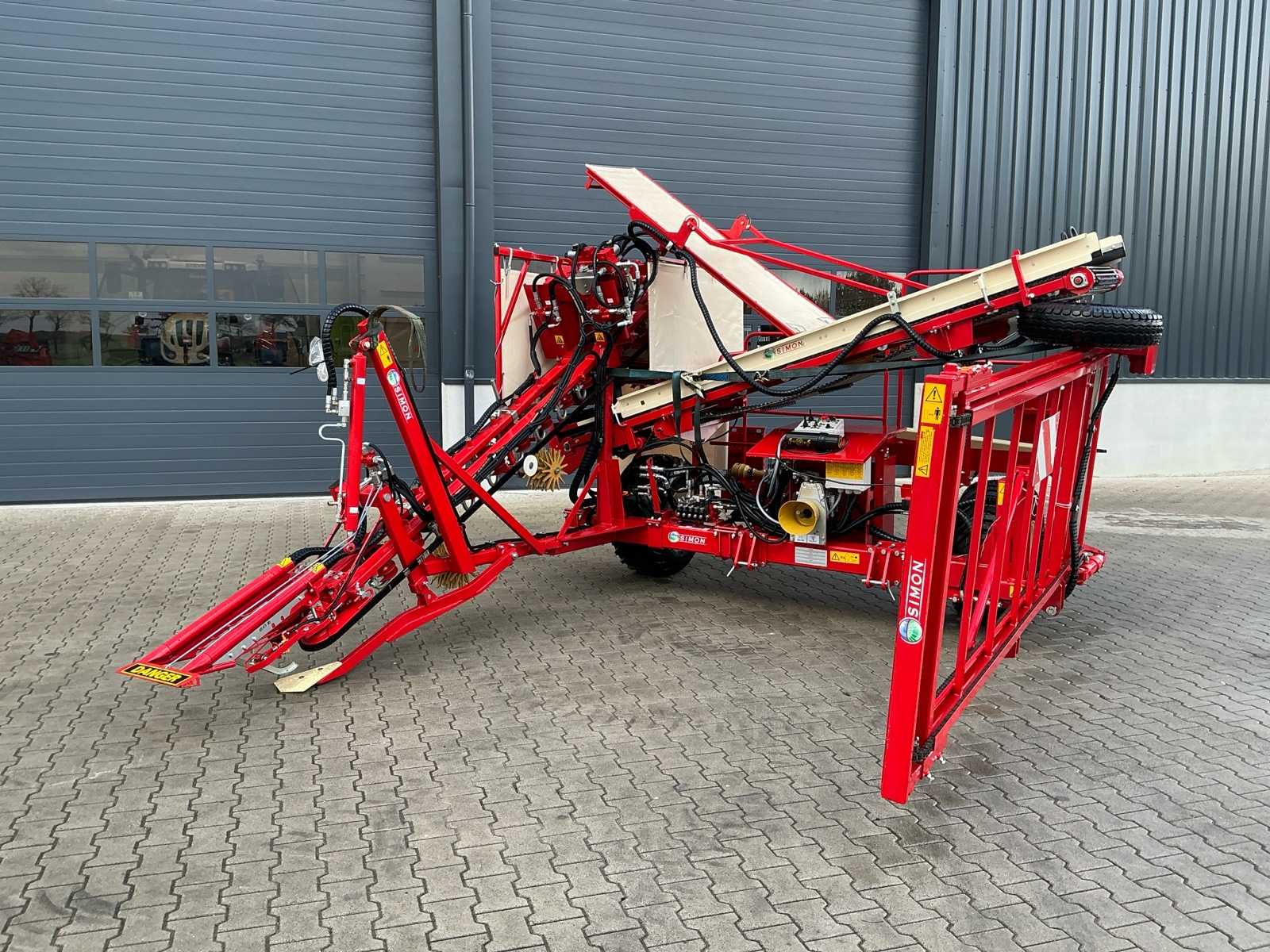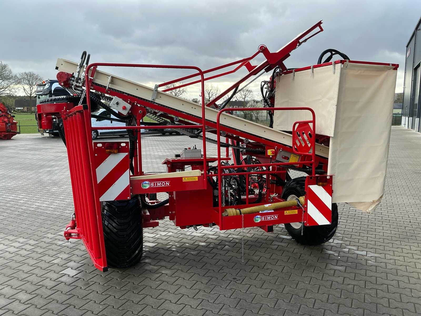 | Description | Equipped with: Simon S3P carrot harvester, unused, 1-row harvester is equipped with SIMON topper system and fully adjustable conveyor belts (forward/reverse and speed adjustable from cabin), lifting range up to 3,750 mm, low pressure belts and a maximum track width of 2,300 mm, haulm lifters, cleaning systems, tilting platform, cross belt (650 mm), PVC coated mats, cleaning options such as rubber stars and cleaning rollers, platform suitable for 2 boxes and hydraulically tiltable, additional options include automatic depth control, hydraulic drive system with double pump, electric emergency stop and full safety equipment with lighting, low pressure tires (RC 400/60 – 15.5, 10 PR, profile 478, 6-hole), diameter: 875 mm, width: 406 mm, electric emergency stop, 1 row, length 3.750 mm (axle to axle), SIMON topper system, conveyor belts: on/off + reversible and speed adjustable from cabin, Front cylinder and fixed attachment points, forced haulm removal, independent speed control of tyres |