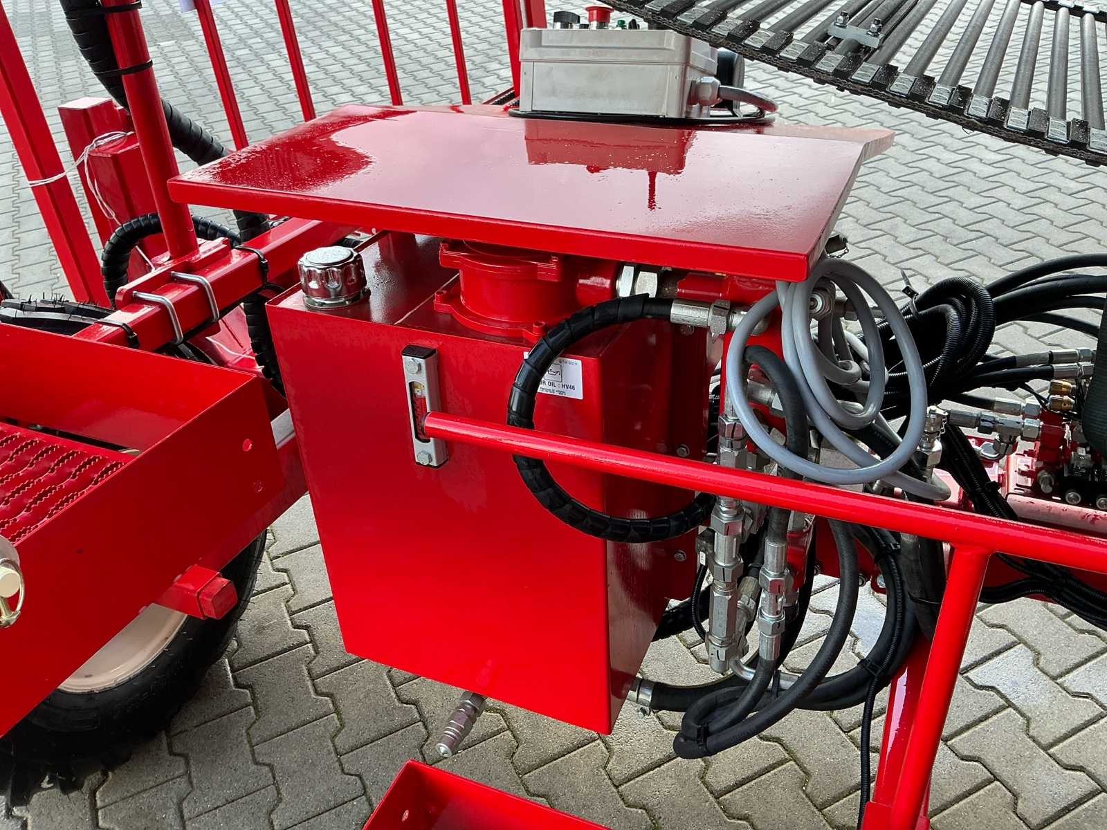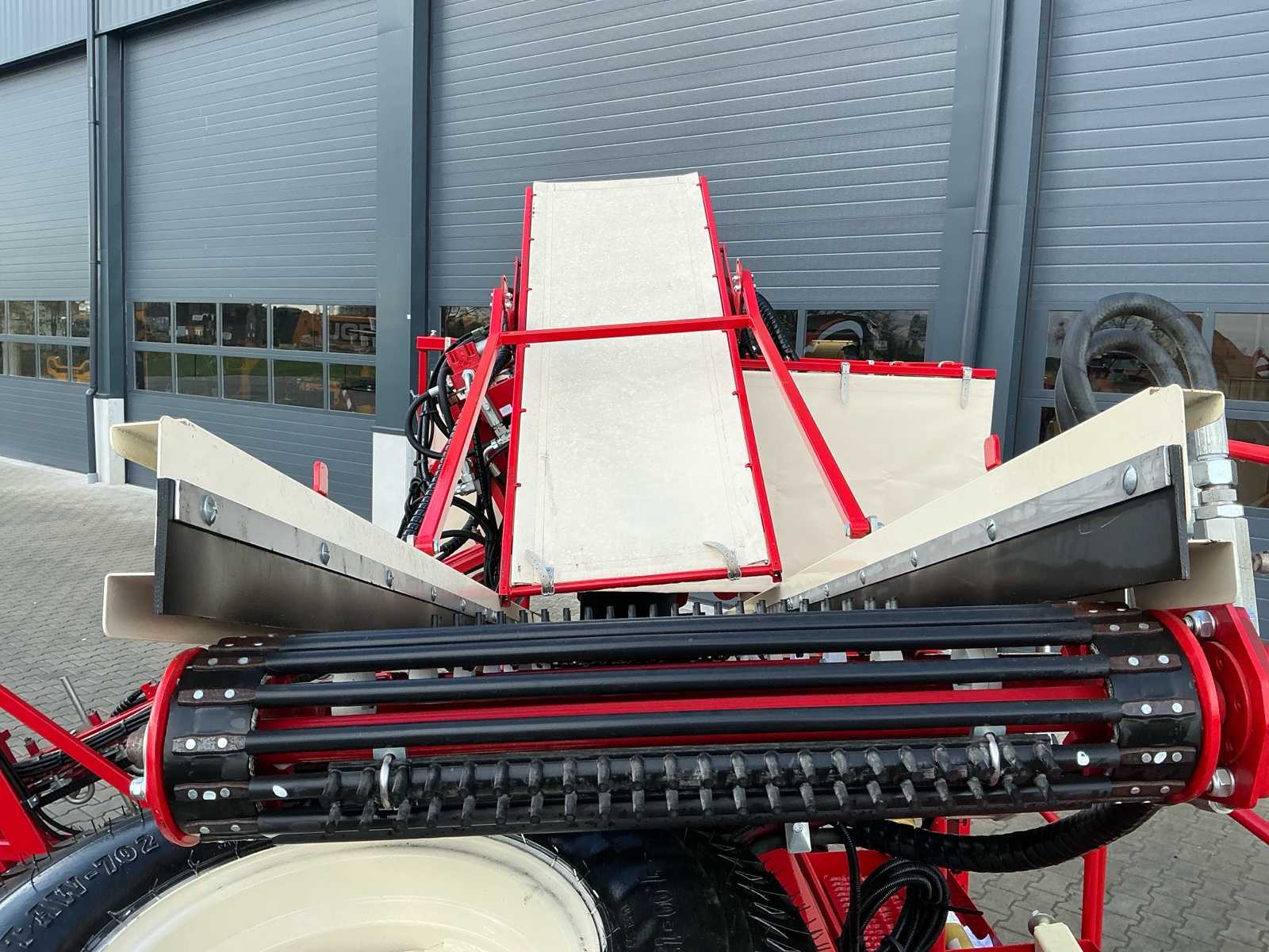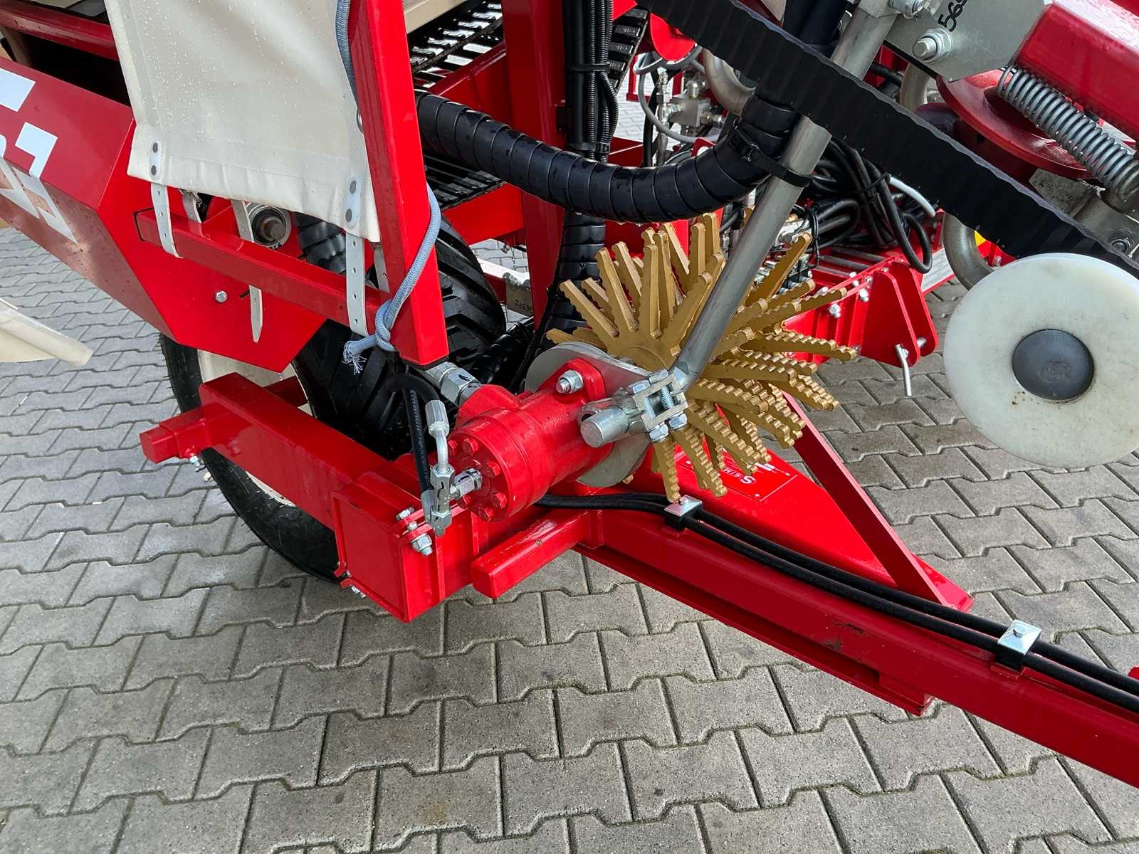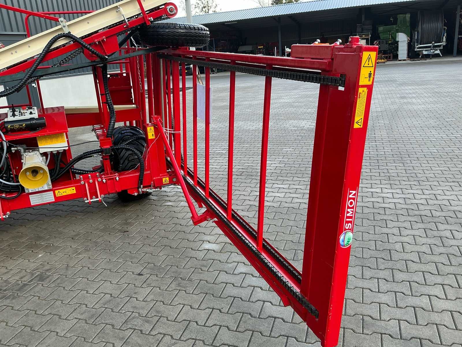 | Description | Equipped with: Simon S3P carrot harvester, unused, 1-row harvester is equipped with SIMON topper system and fully adjustable conveyor belts (forward/reverse and speed adjustable from cabin), lifting range up to 3,750 mm, low pressure belts and a maximum track width of 2,300 mm, haulm lifters, cleaning systems, tilting platform, cross belt (650 mm), PVC coated mats, cleaning options such as rubber stars and cleaning rollers, platform suitable for 2 boxes and hydraulically tiltable, additional options include automatic depth control, hydraulic drive system with double pump, electric emergency stop and full safety equipment with lighting, low pressure tires (RC 400/60 – 15.5, 10 PR, profile 478, 6-hole), diameter: 875 mm, width: 406 mm, electric emergency stop, 1 row, length 3.750 mm (axle to axle), SIMON topper system, conveyor belts: on/off + reversible and speed adjustable from cabin, Front cylinder and fixed attachment points, forced haulm removal, independent speed control of tyres |