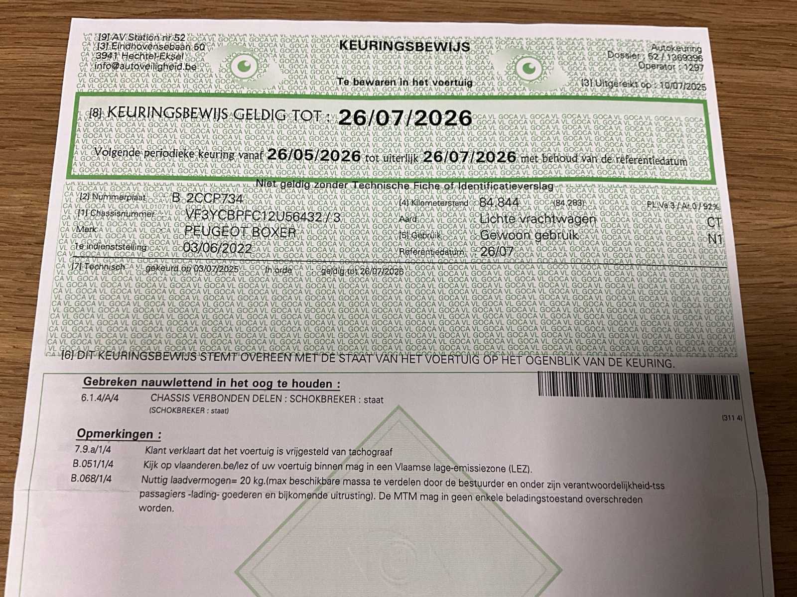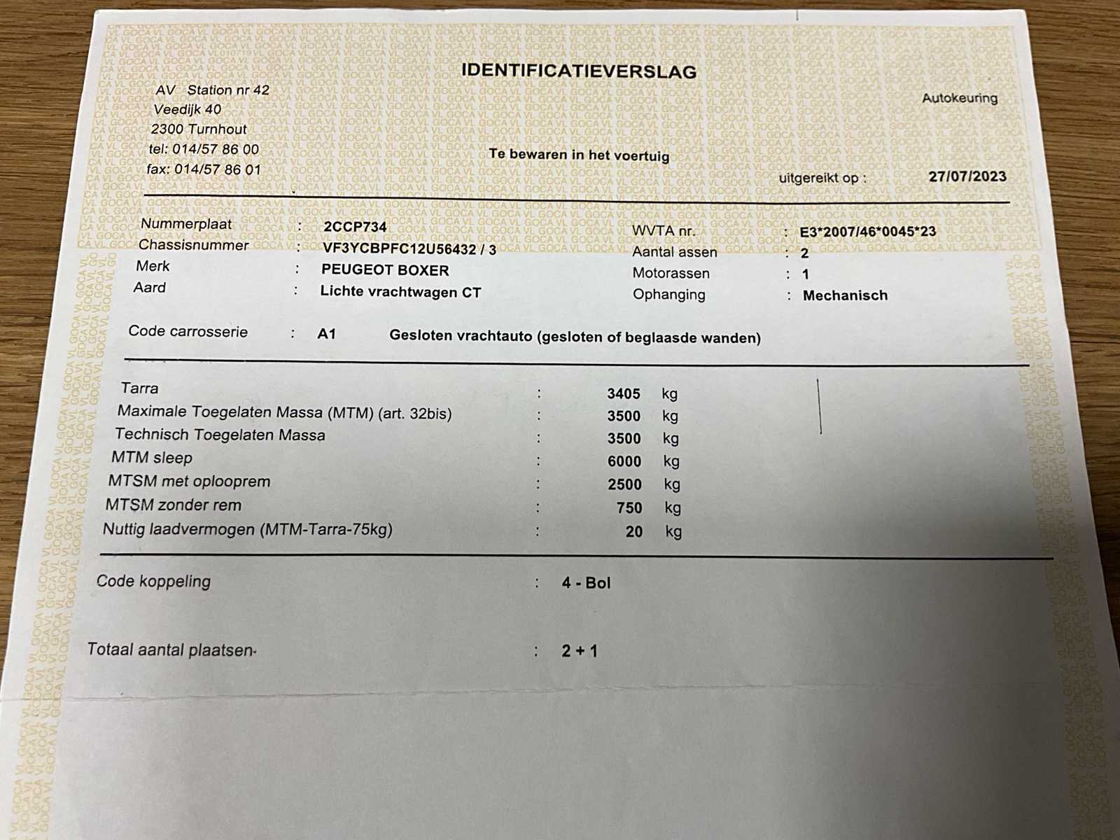 | Description | Remnants of stickers present, slight damage to the front right and mirror (see photos).- dashboard indicates that rear doors are not closed but this is the case (so incorrect message) – side door does not open due to externally placed lock (must be easily dismantled – air conditioning, navigation – valid technical inspection carried out at 85000km – total length 5998mm – attention: load capacity is incorrectly stated on identification report (is standard about 1400kg) |
