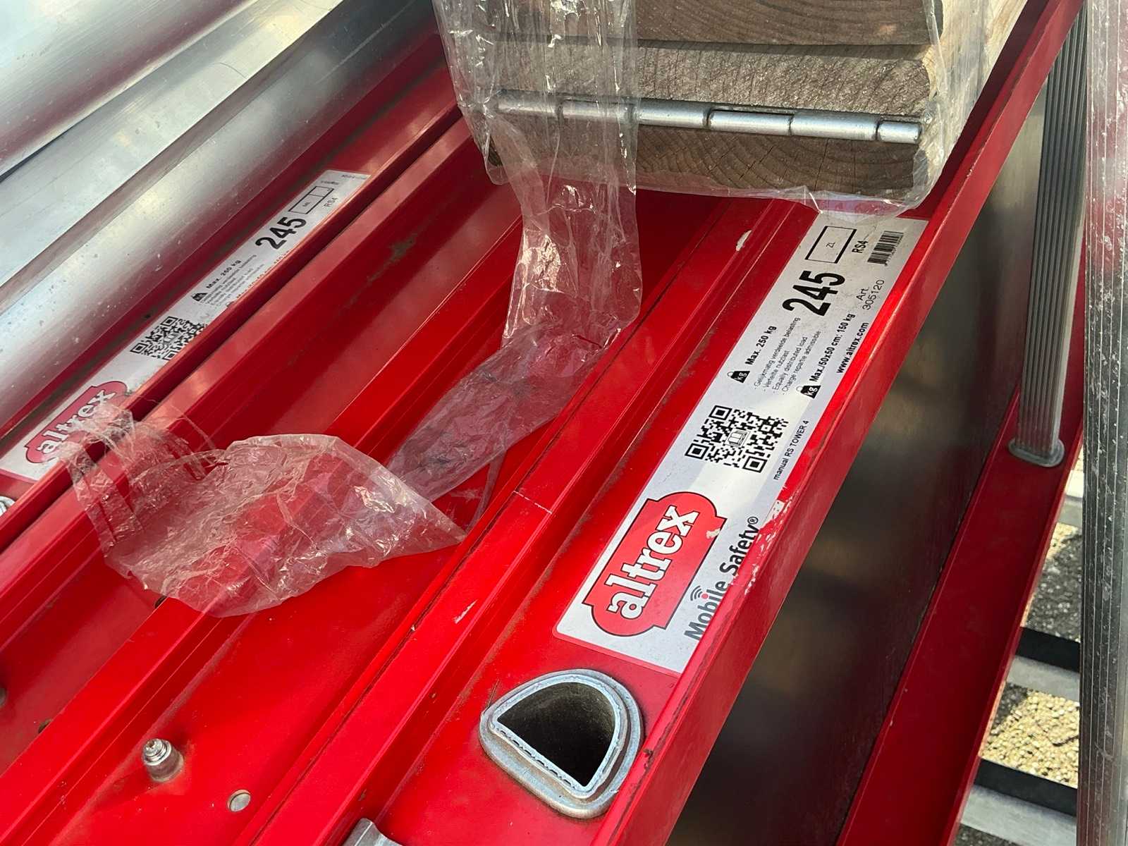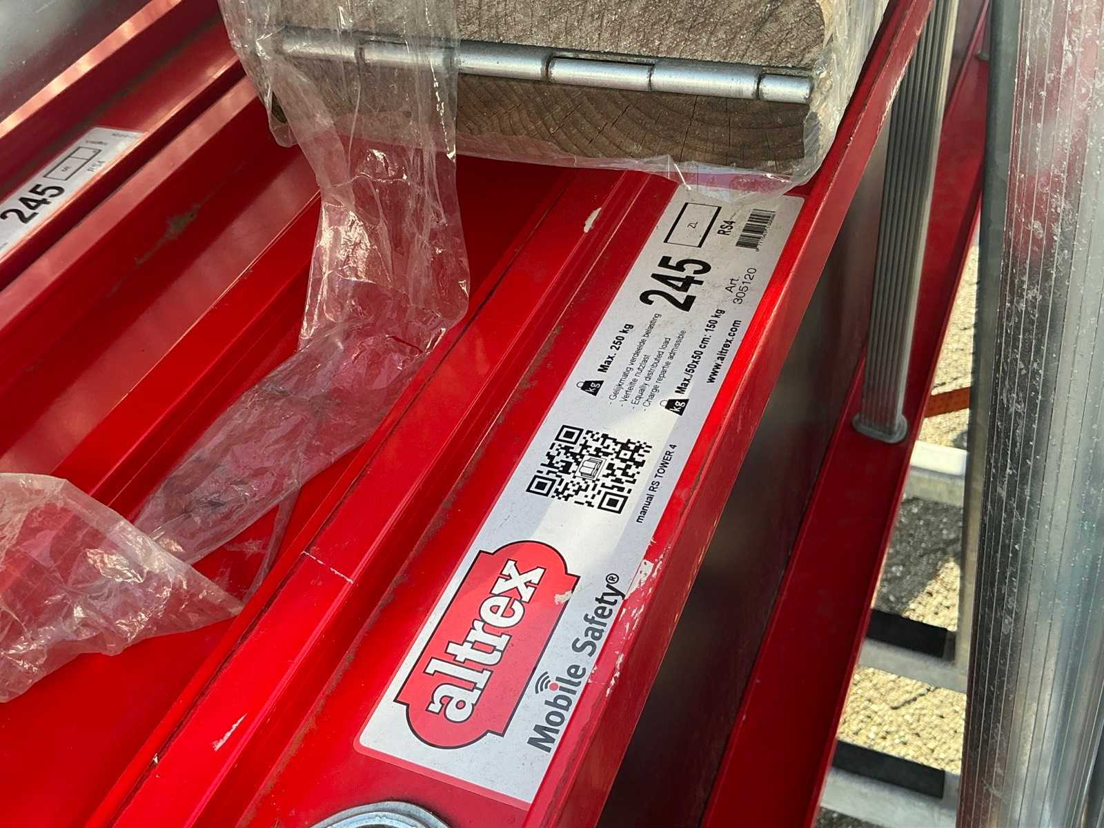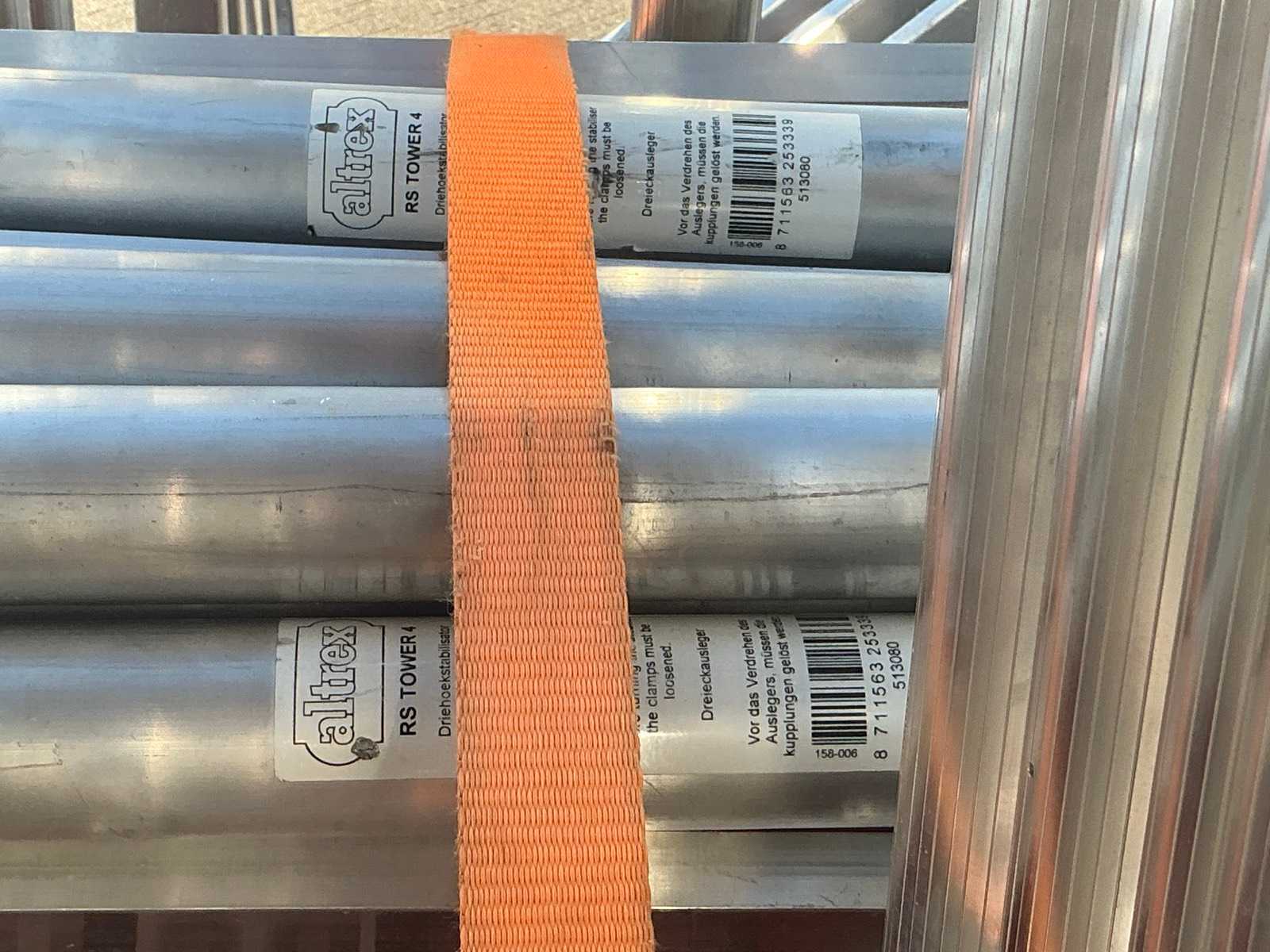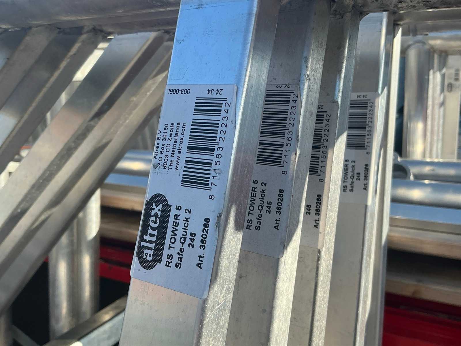 Altrex RS tower 4, 4 platforms, 4 wheels, 9 RS tower mounting frames, 4x stabilizer bar, 8x Safe Quick 2 RS tower 5. 10 meters working height total.