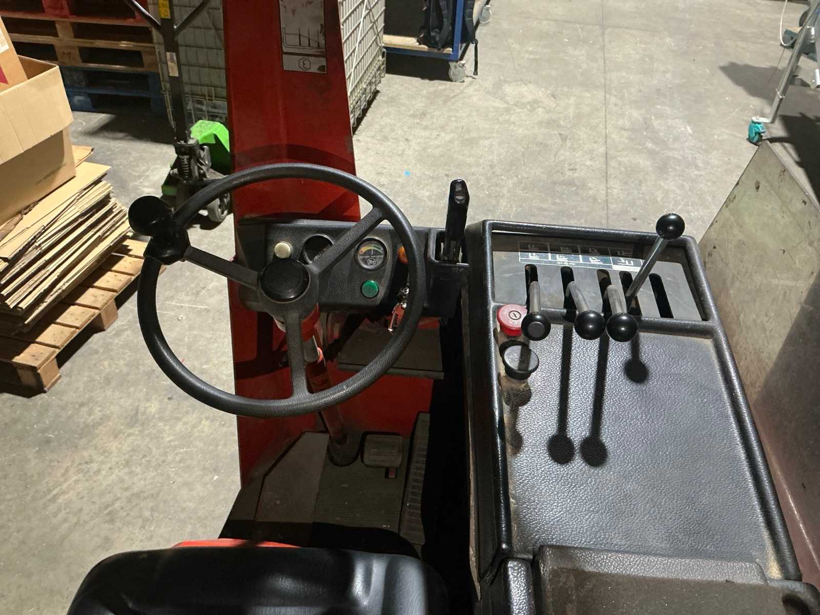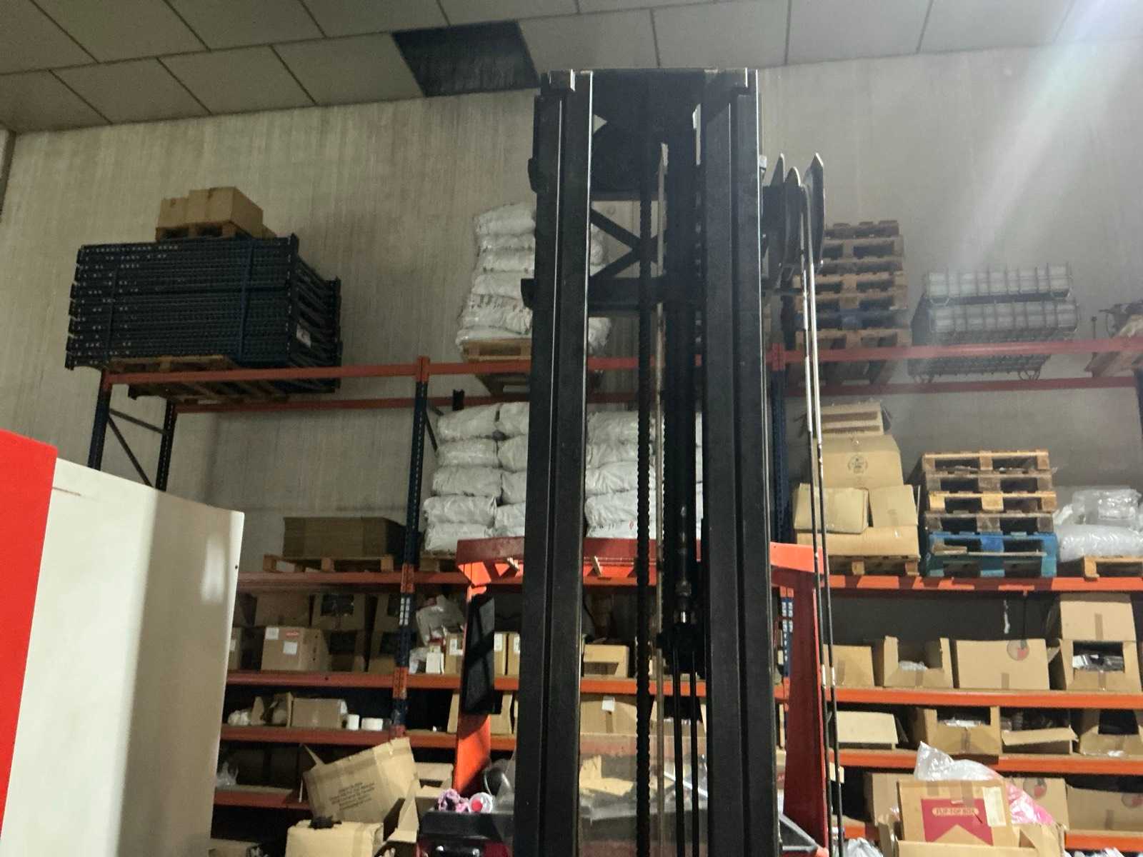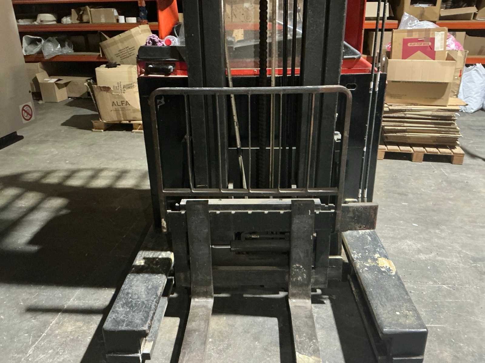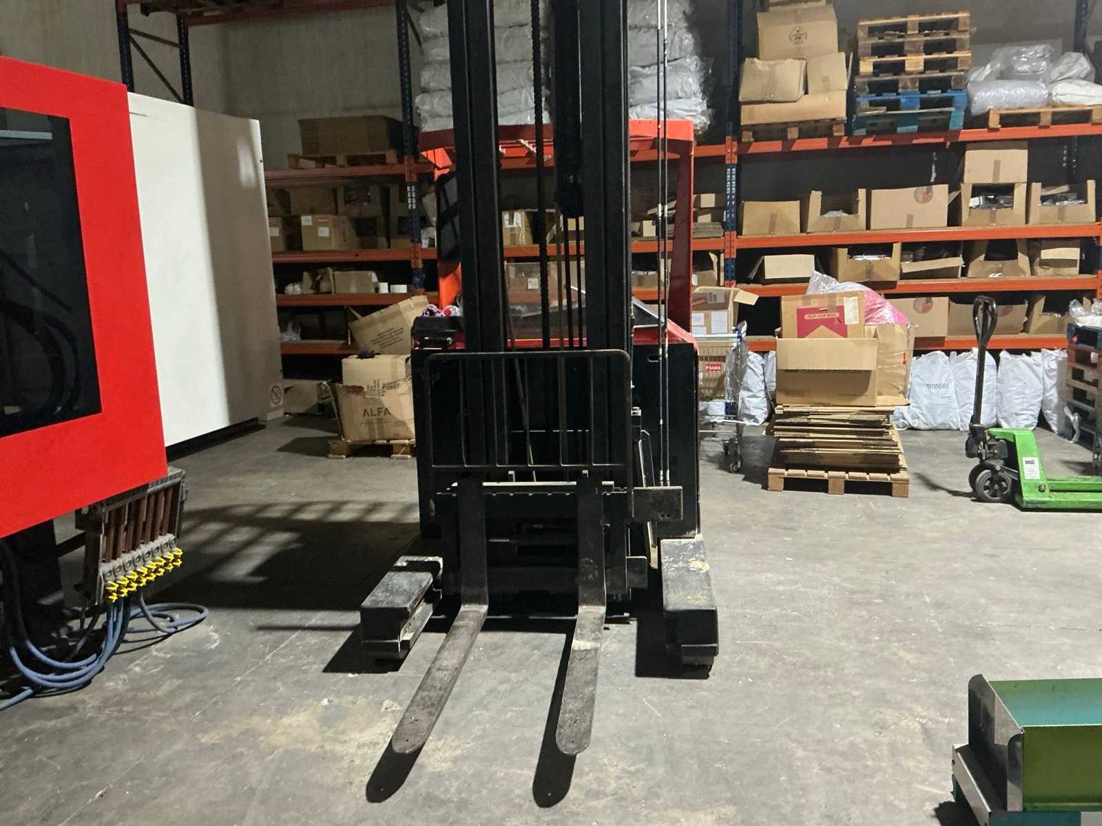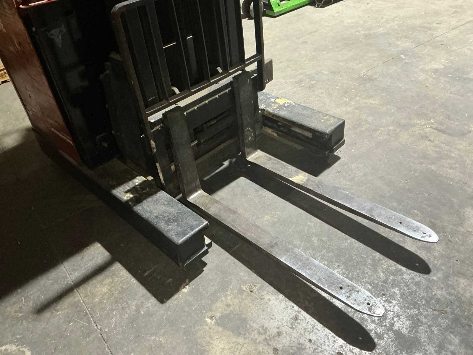 Equipped with multi-lever control console, adjustable forks, front protection guard, battery charger, double mast, rotating fork carriage, side shift; distance between pallet forks approx. 350 mm.