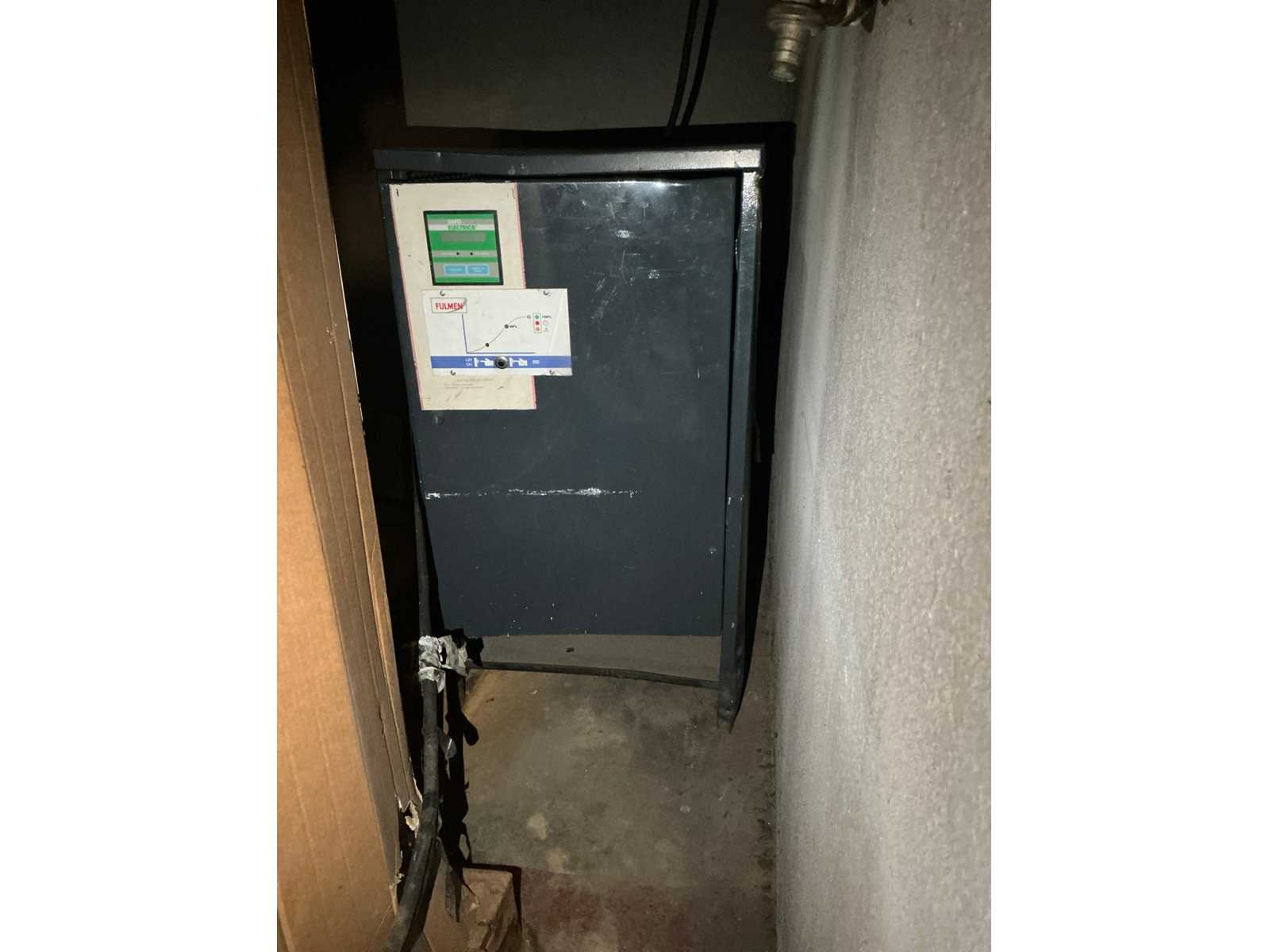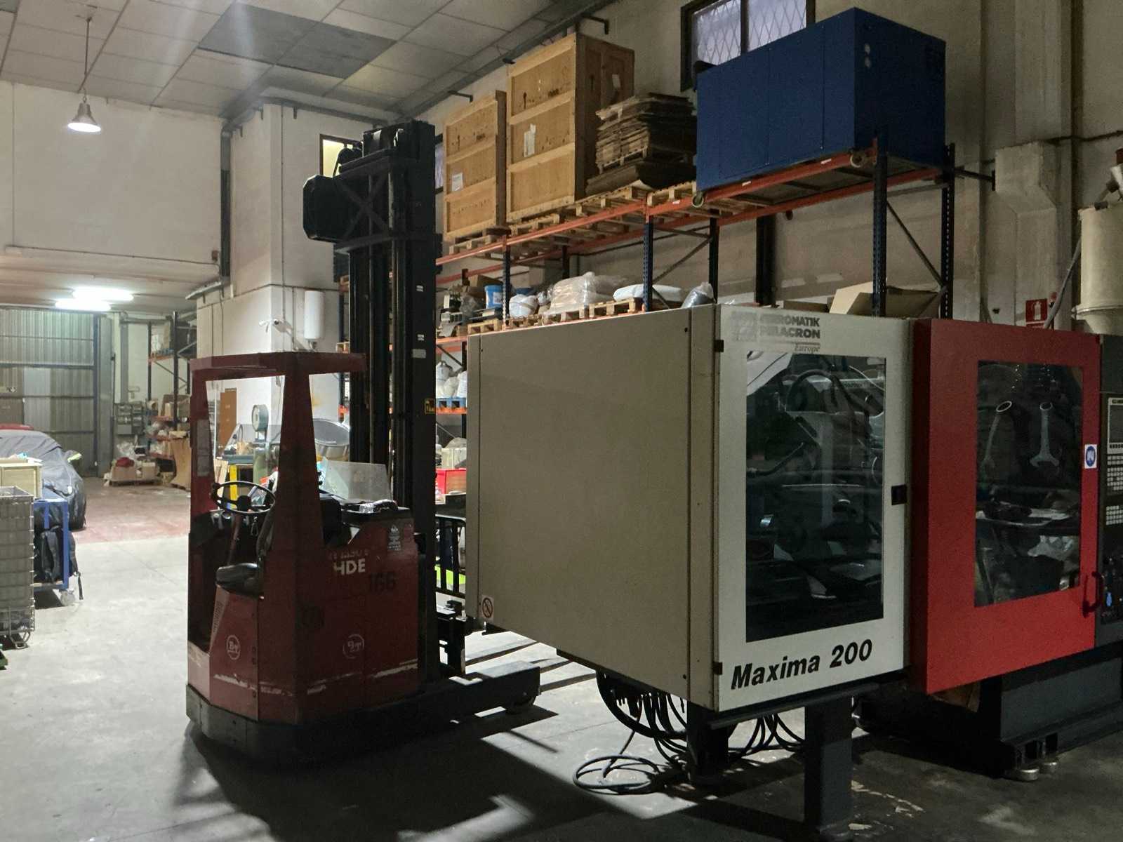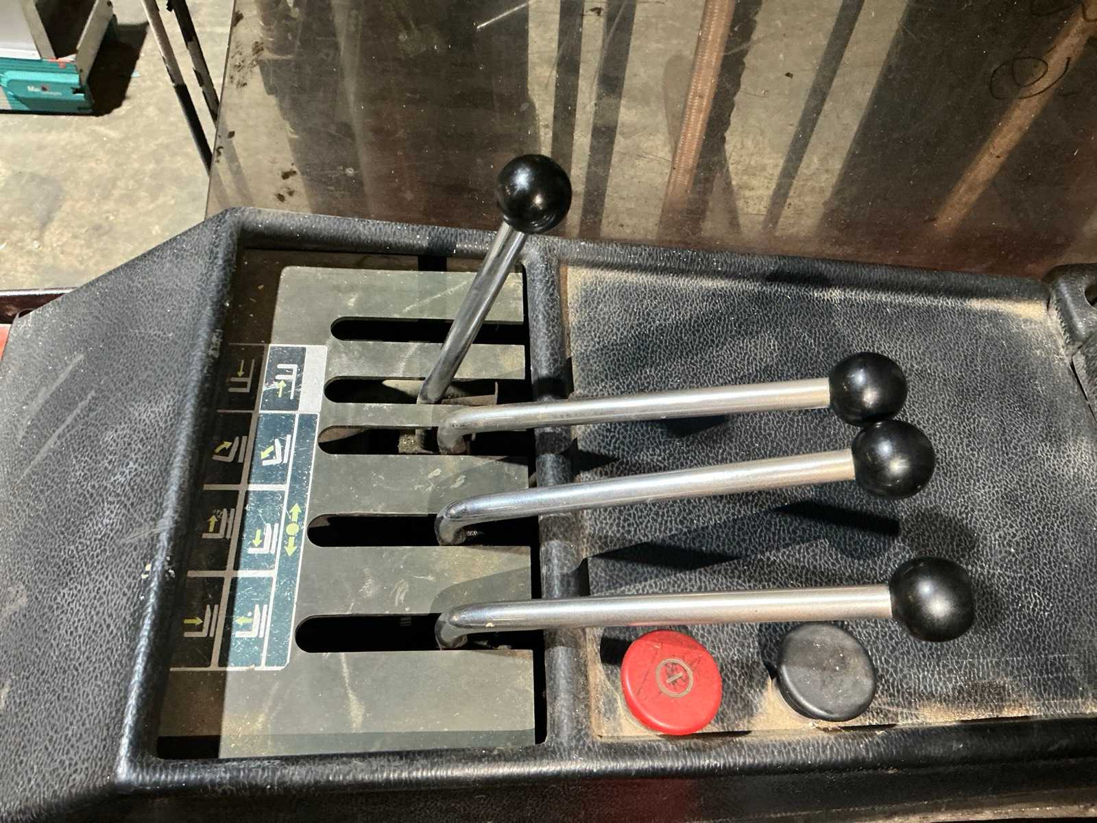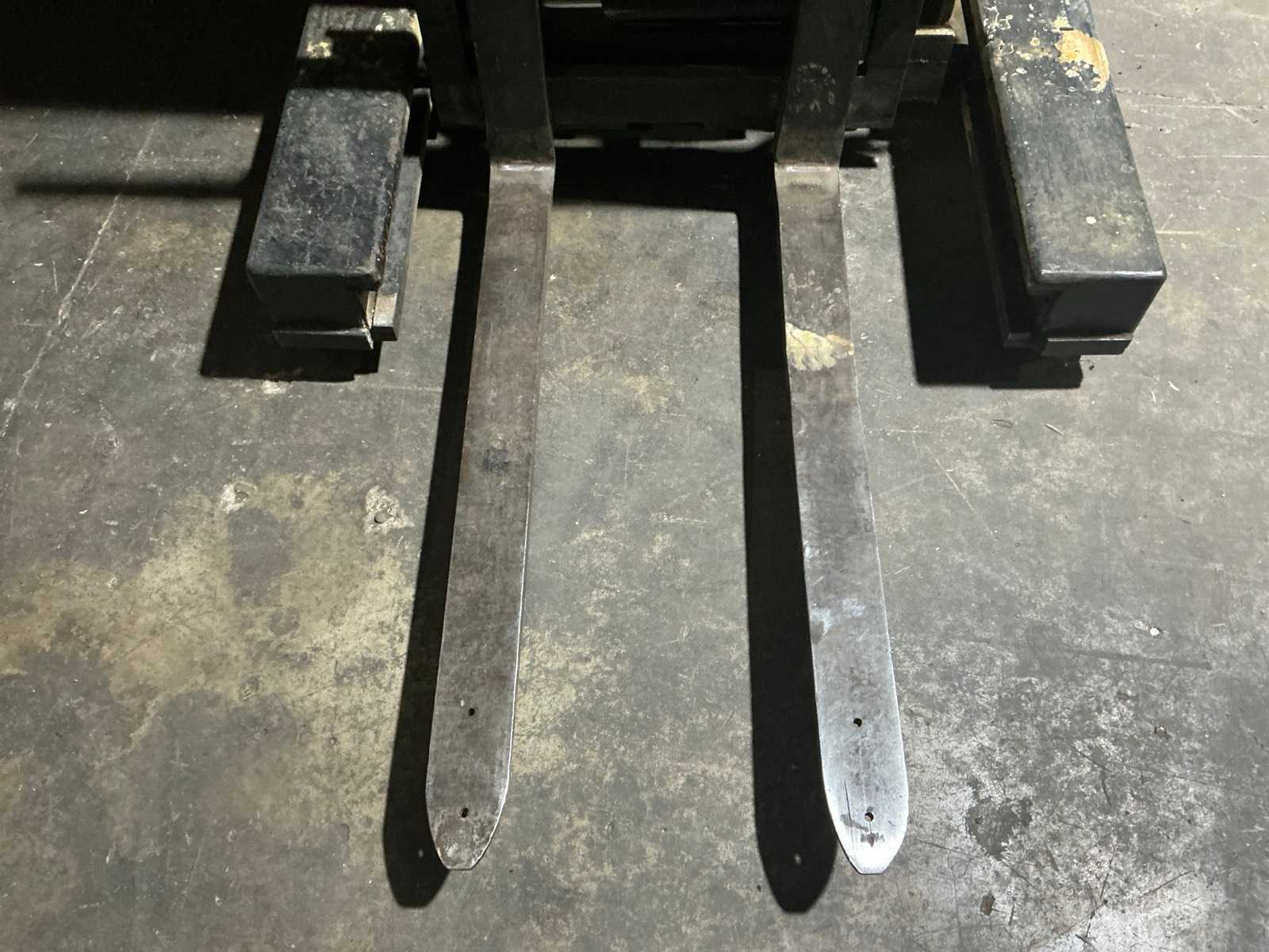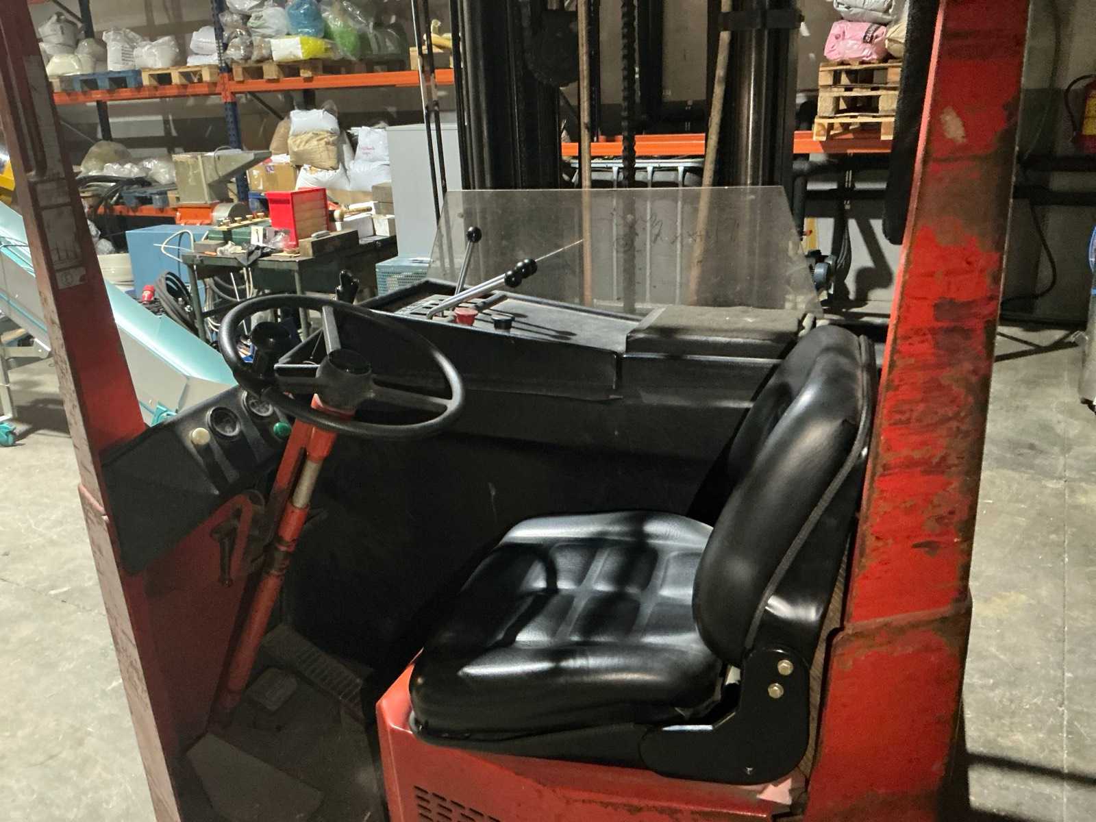 Equipped with multi-lever control console, adjustable forks, front protection guard, battery charger, double mast, rotating fork carriage, side shift; distance between pallet forks approx. 350 mm.