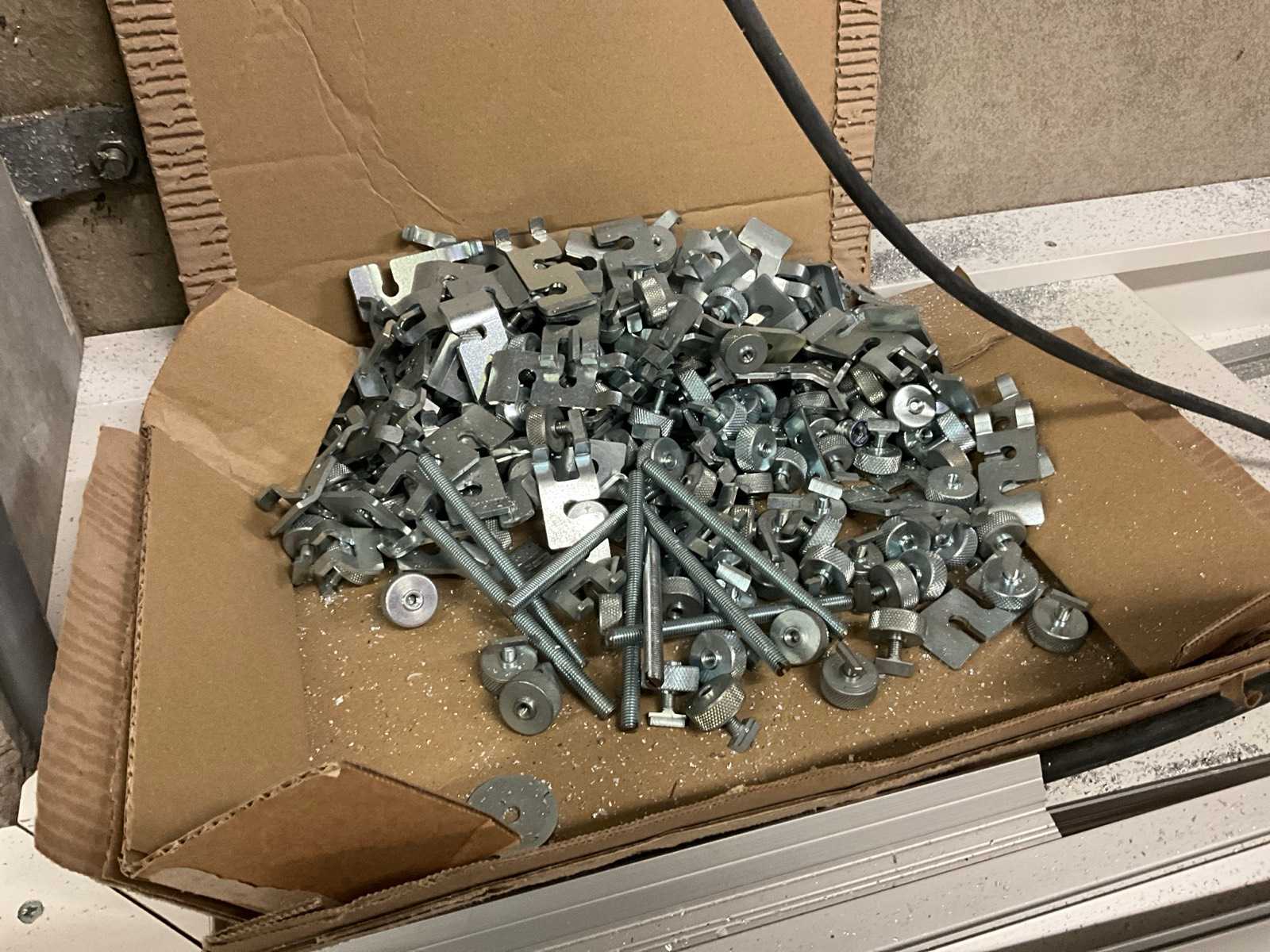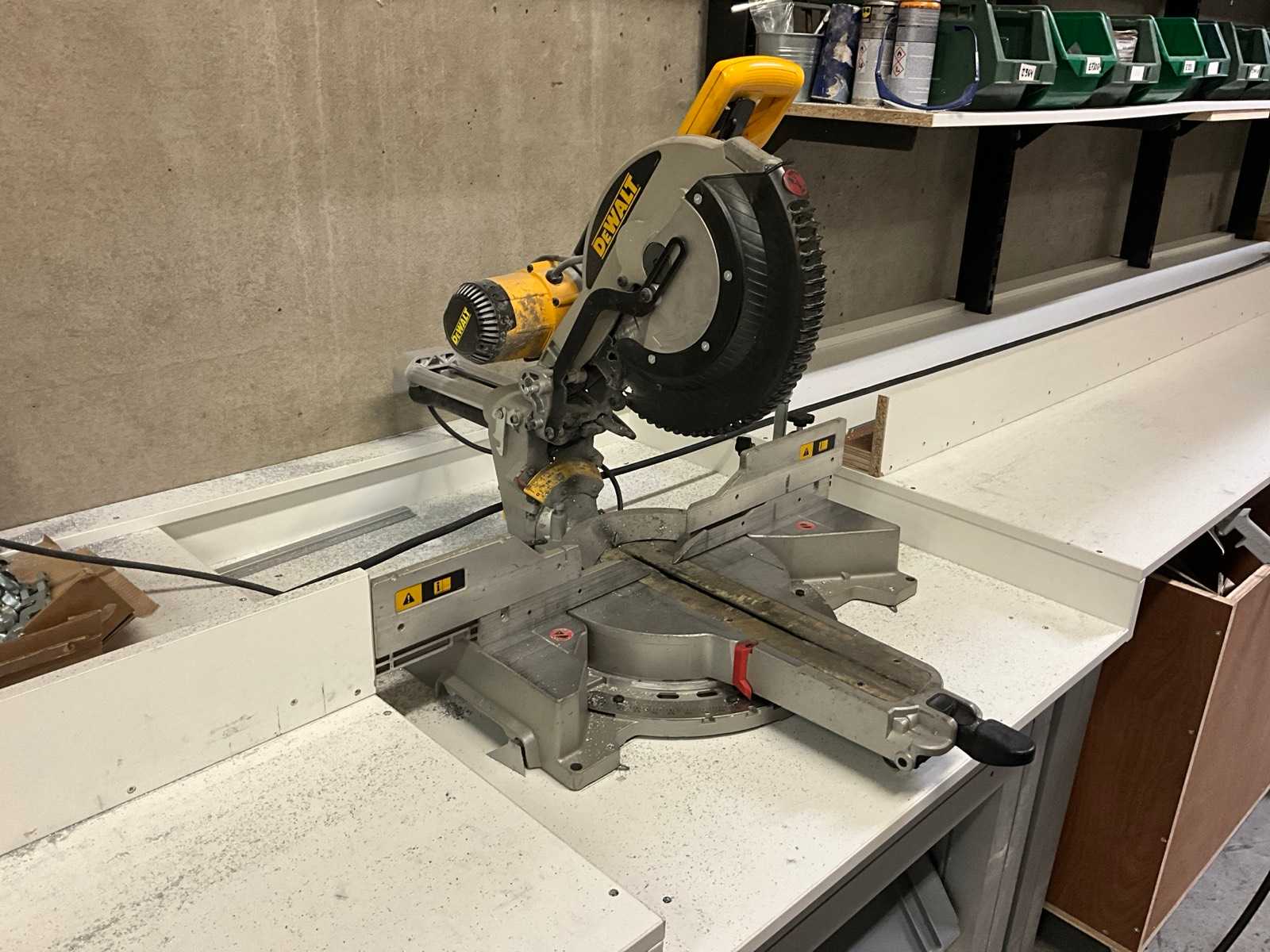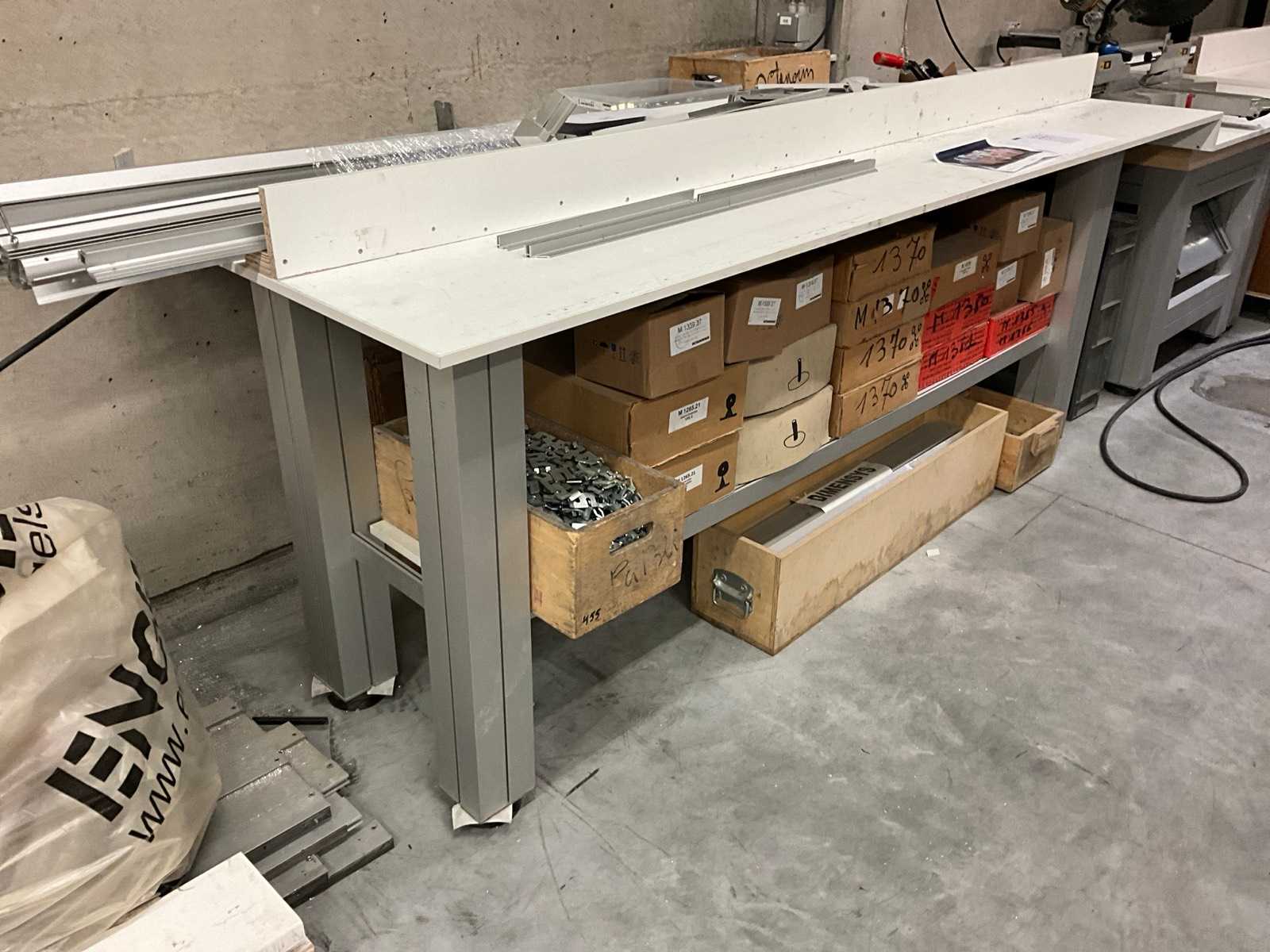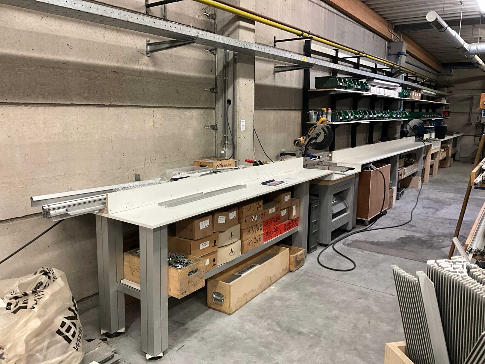 | Description | Consisting of crosscut circular saw machine Dewalt type DWS780 on saw table, + 2x worktable widths 2750 + 4800 mm with content various aluminum cut profiles + mounting pieces, + wall warehouse rack with content various mounting pieces |