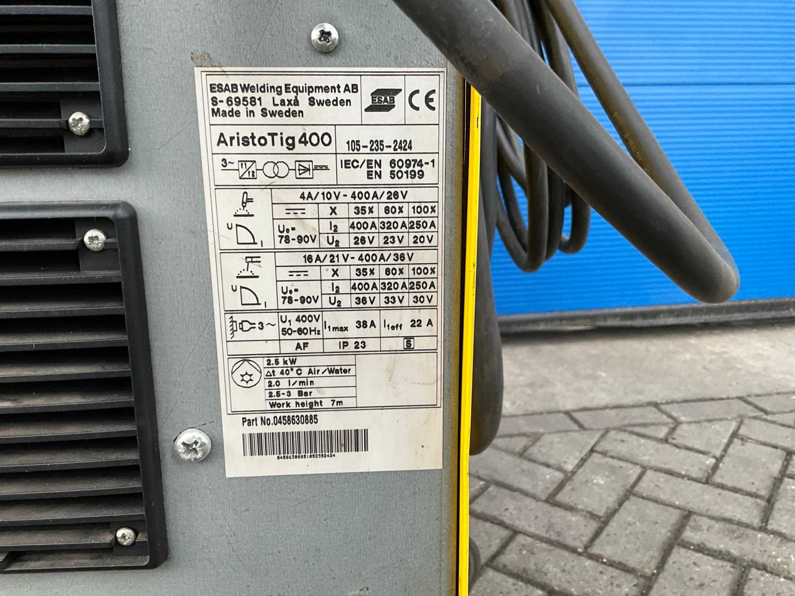 | Description | ESAB AristoTig 400 TIG Welding Machine; serial number 105-235-2424; TIG version; maximum ampere load 400 A. |