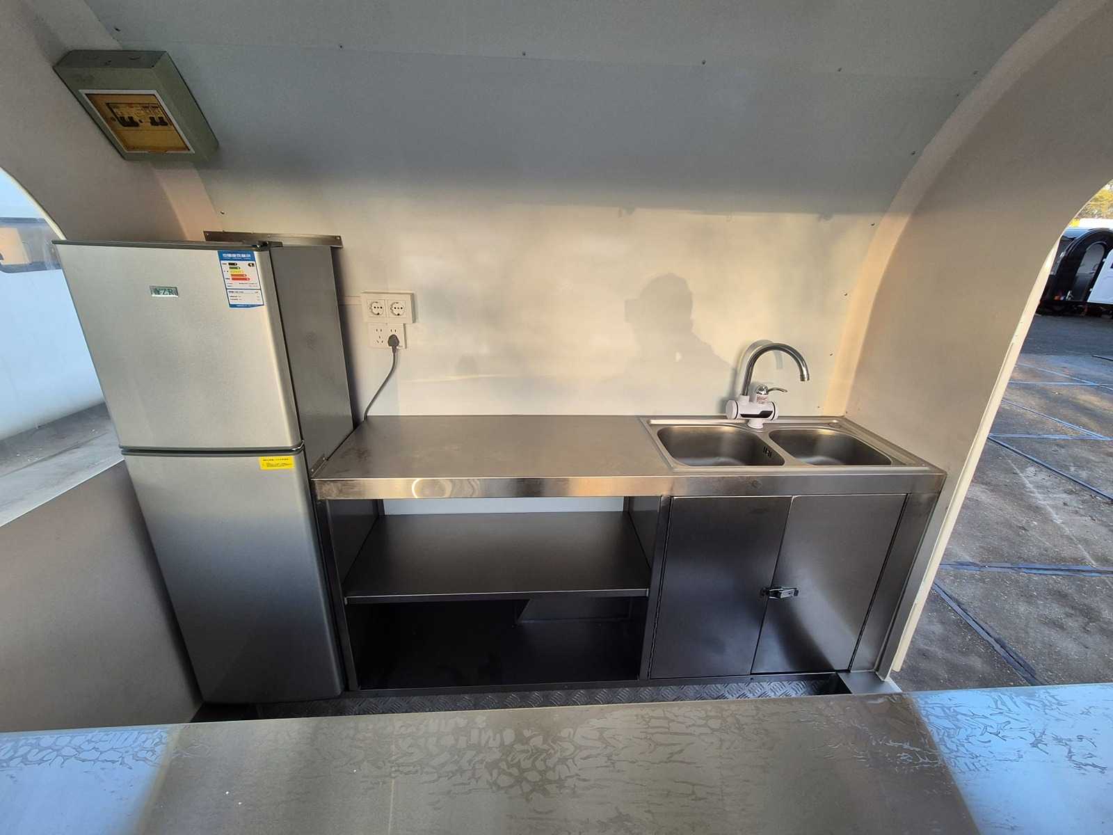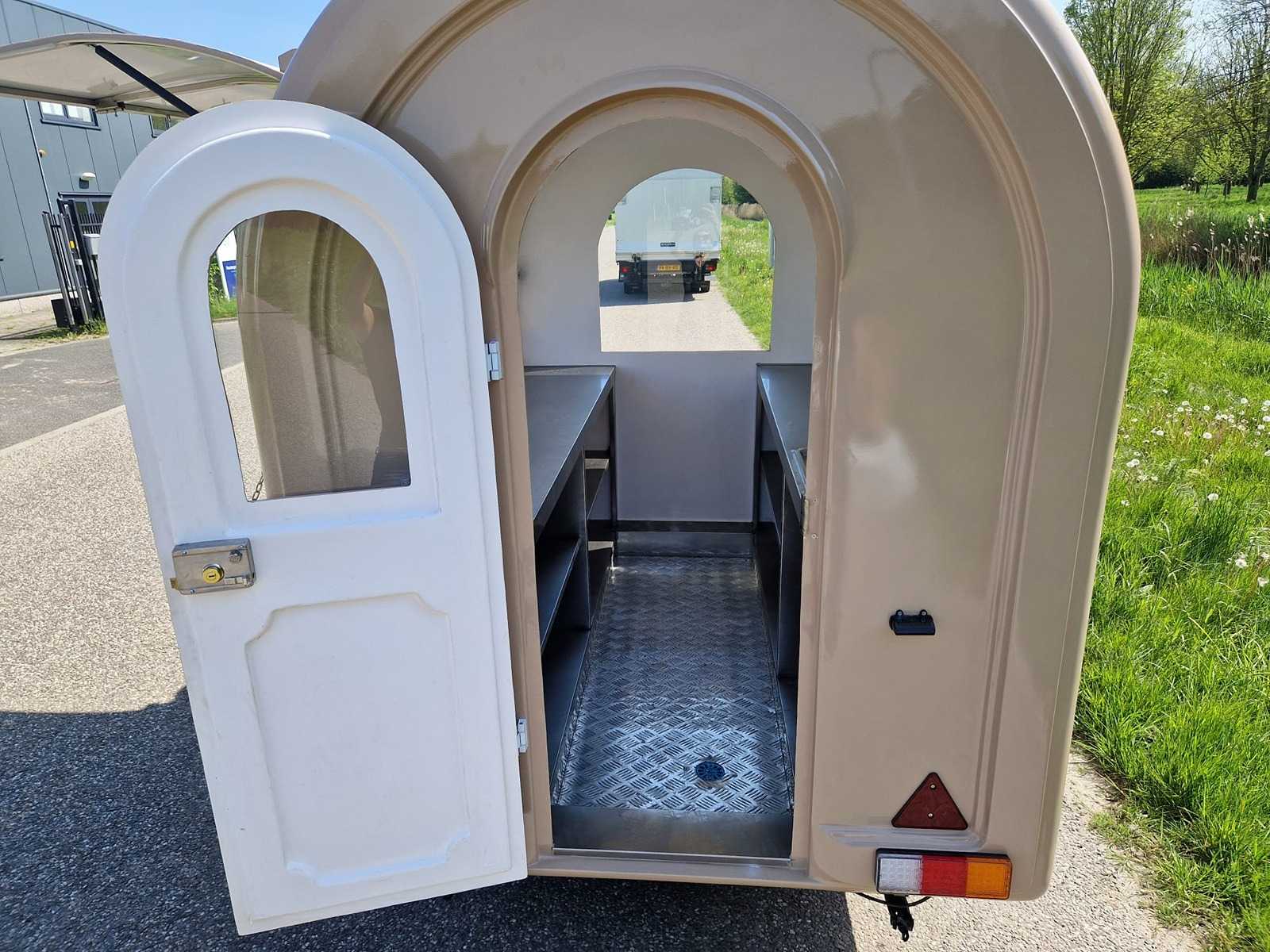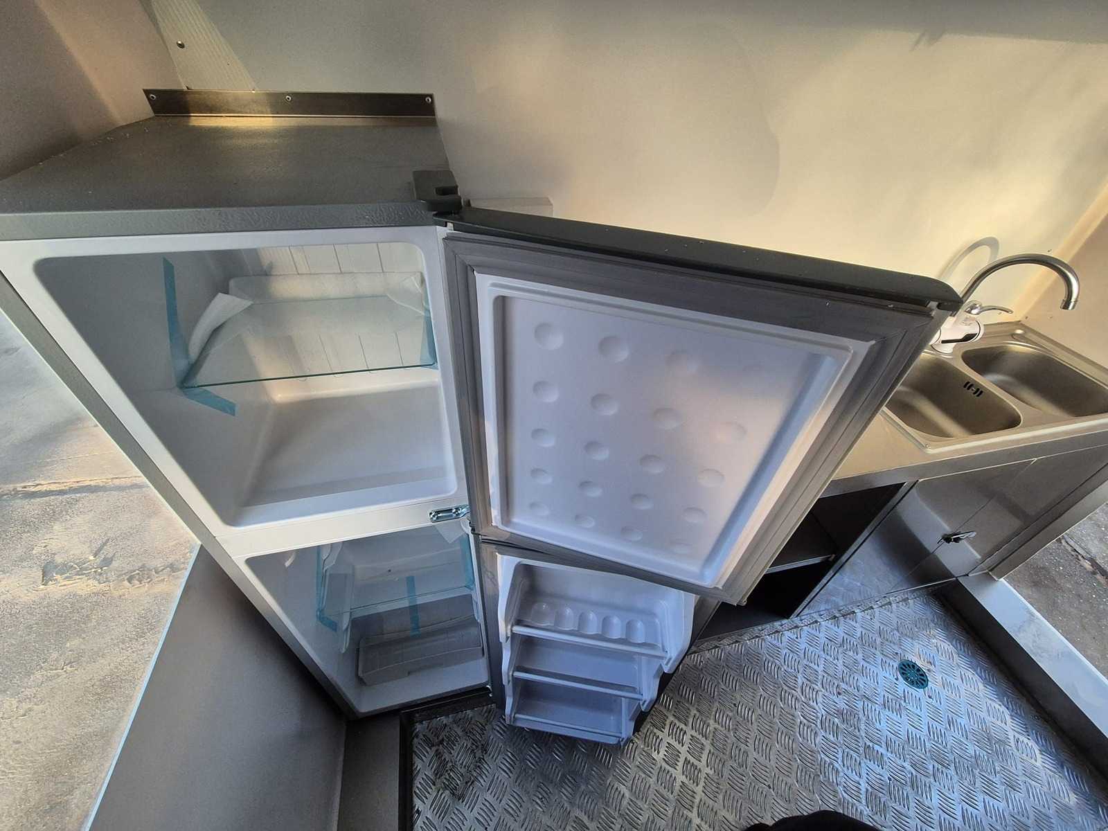 Beige food truck with LED lighting, stainless steel built-in kitchen / workbench, refrigerator, group cupboard, stabilizing legs.