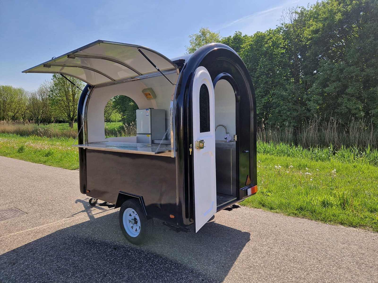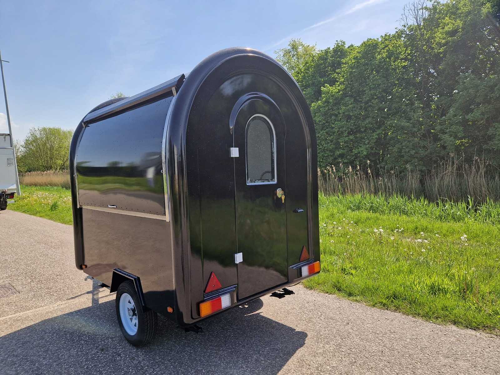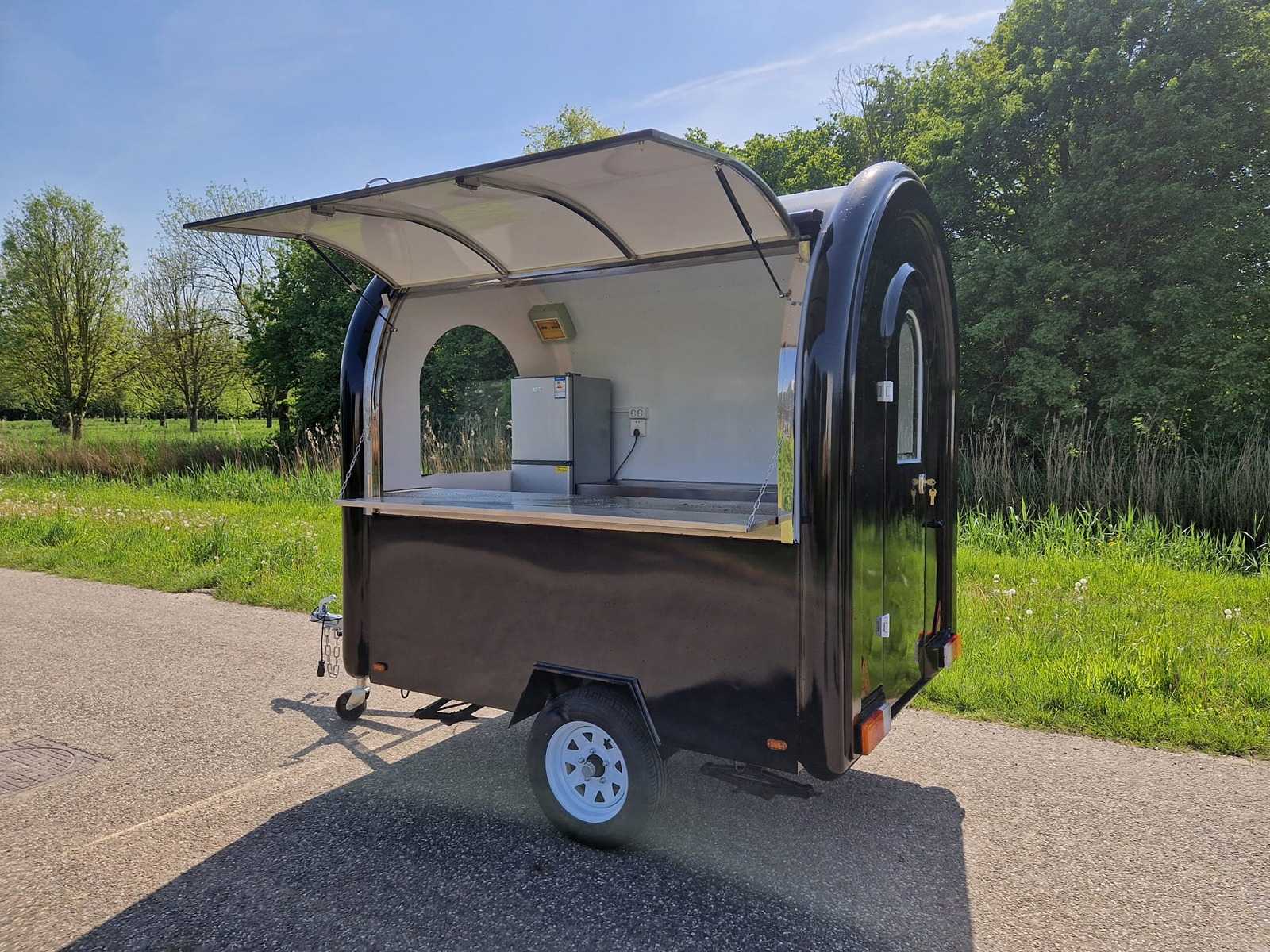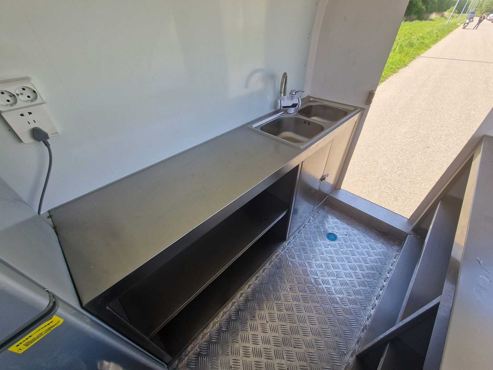| Description | Black food truck with LED lighting, stainless steel fitted kitchen / workbench, group box, cooling, stabilizing legs. Dimensions and weight: Length: 220 cm (cabin), total 320 cm |