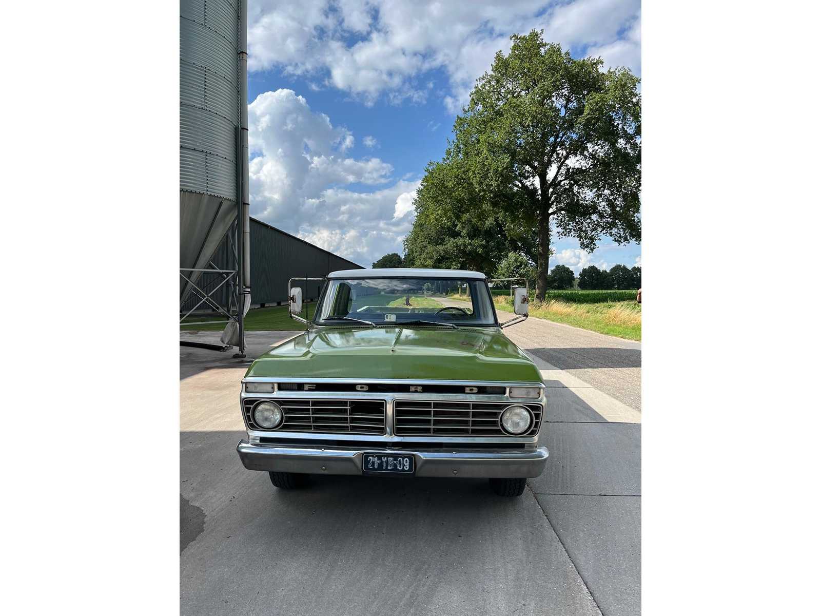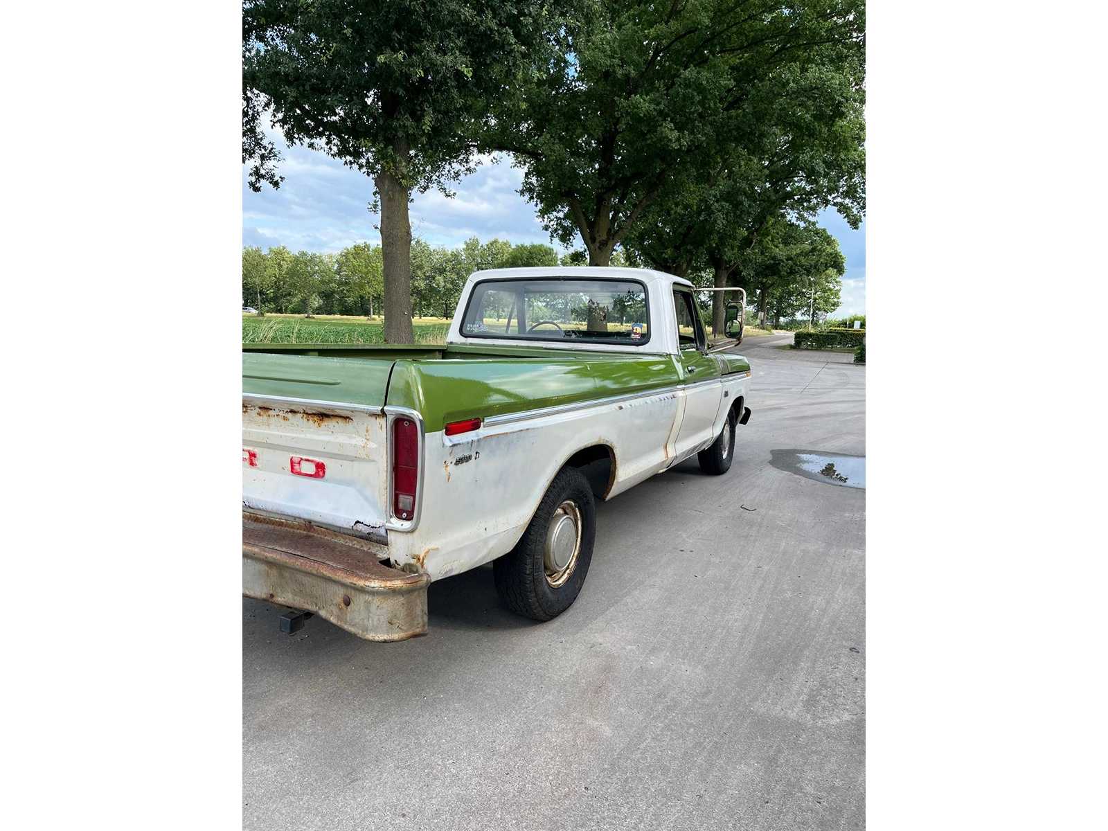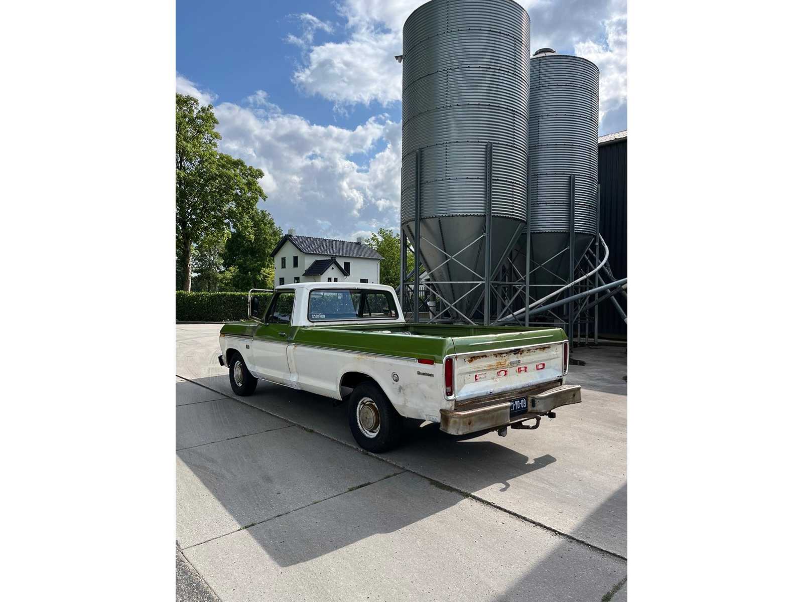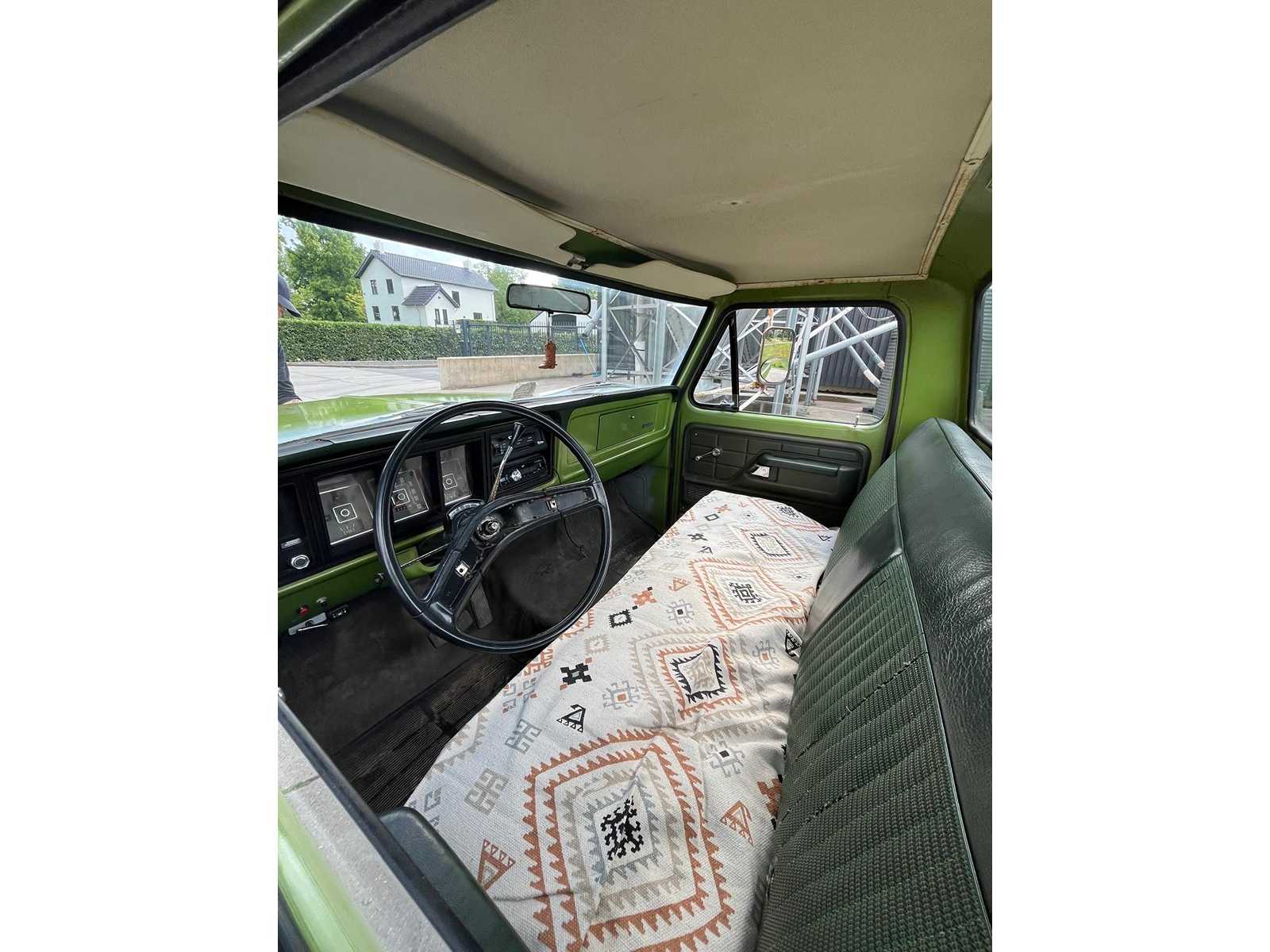 This F100 immediately stands out with its beautiful two-tone color scheme in fresh white with olive green accents – a perfect combination that further emphasizes its vintage look. The classic grille with the recognizable FORD emblem, the round headlights and the original steel wheels complete the picture.
