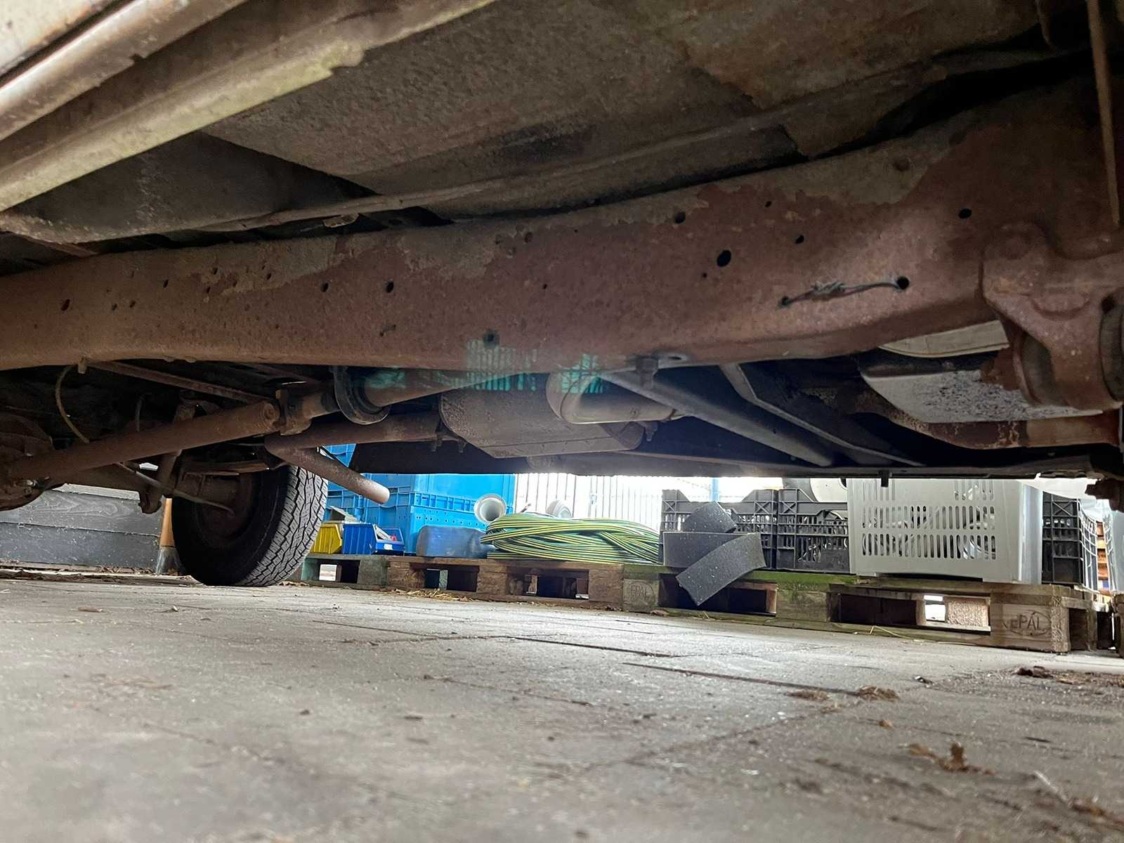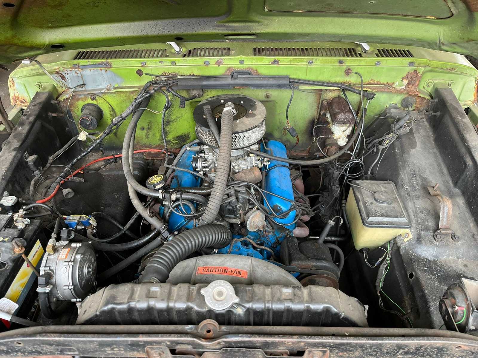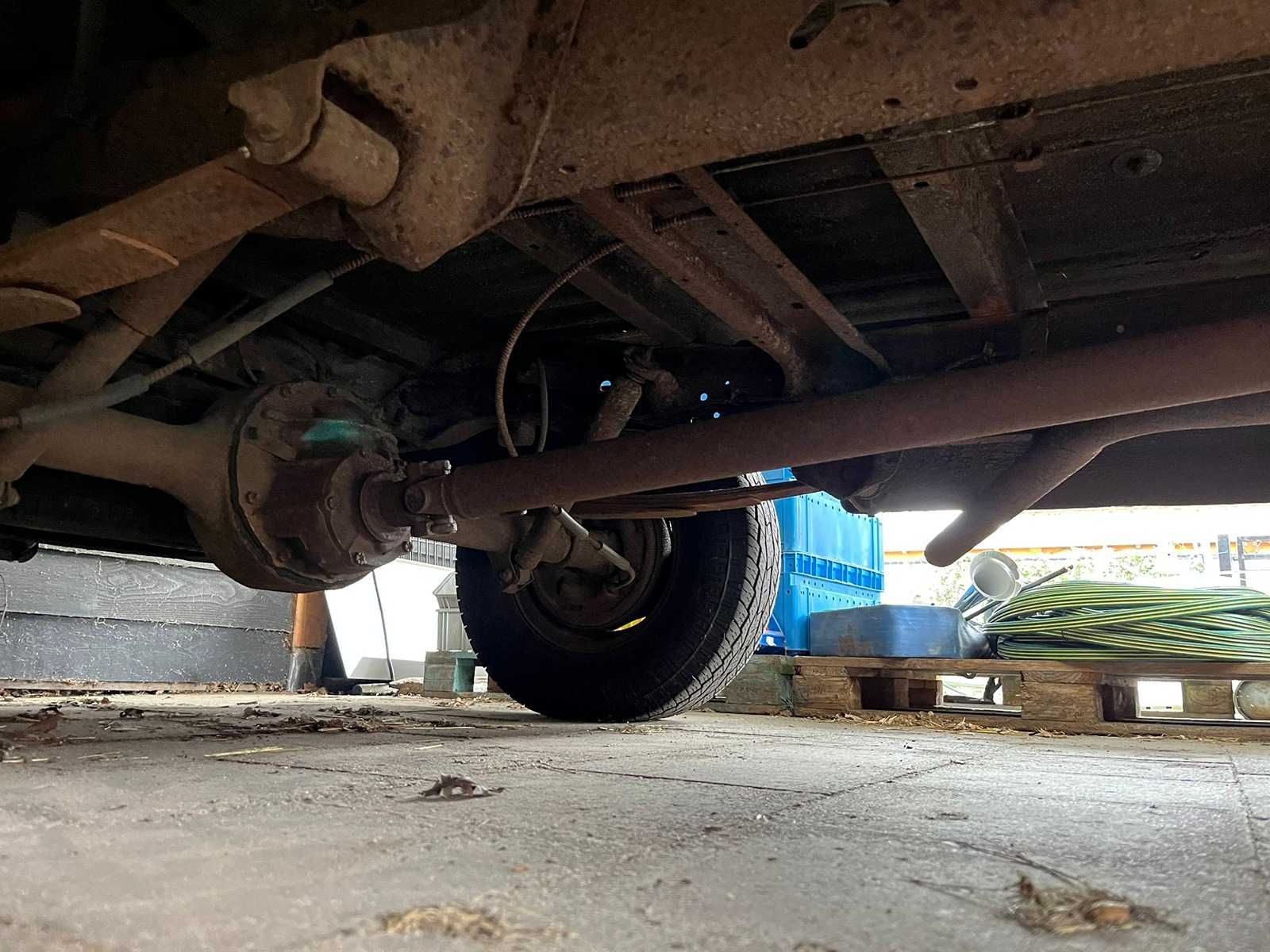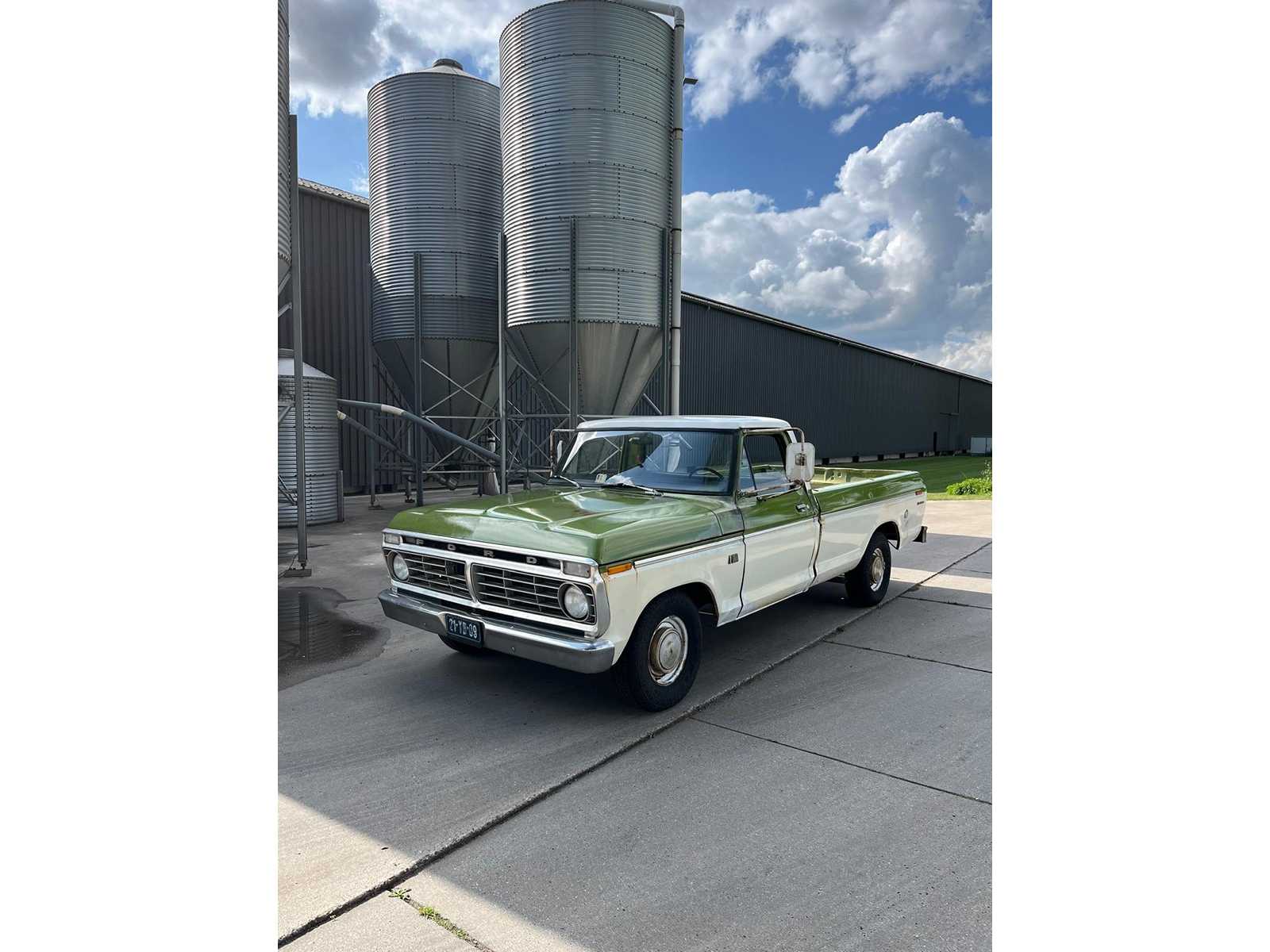 This F100 immediately stands out with its beautiful two-tone color scheme in fresh white with olive green accents – a perfect combination that further emphasizes its vintage look. The classic grille with the recognizable FORD emblem, the round headlights and the original steel wheels complete the picture.