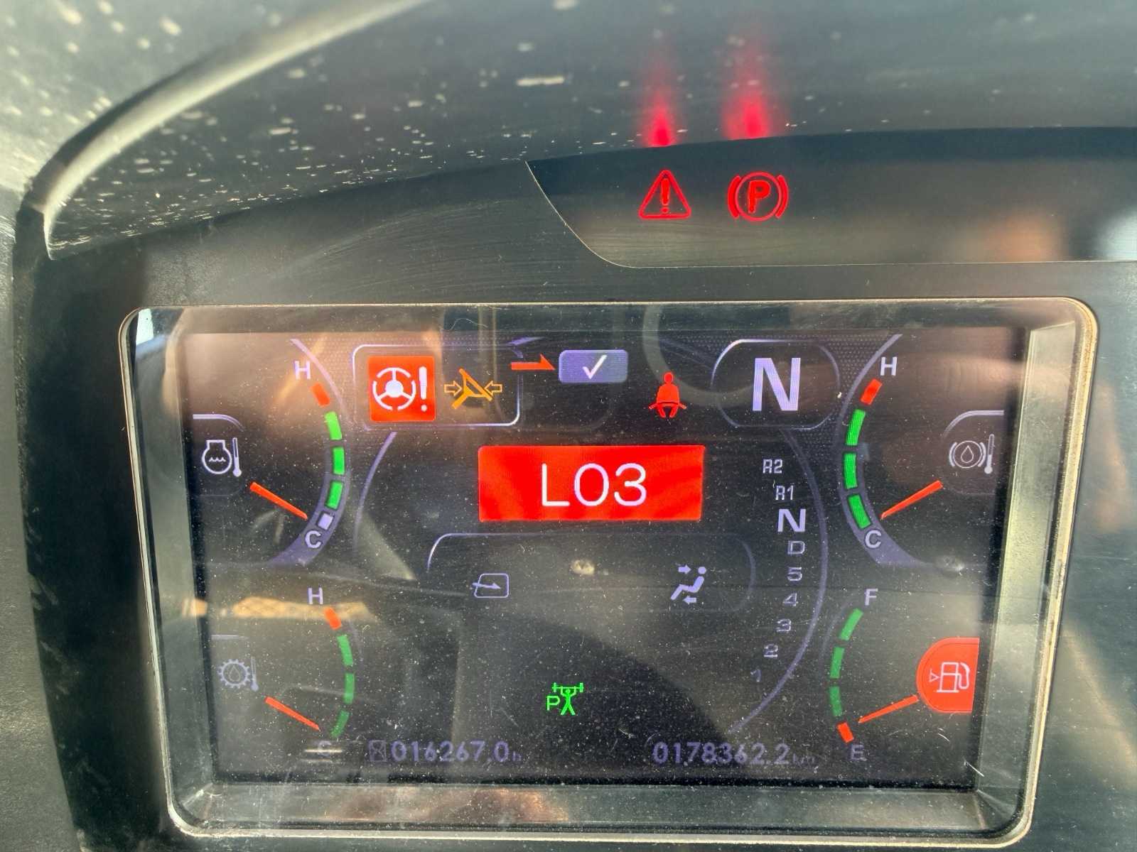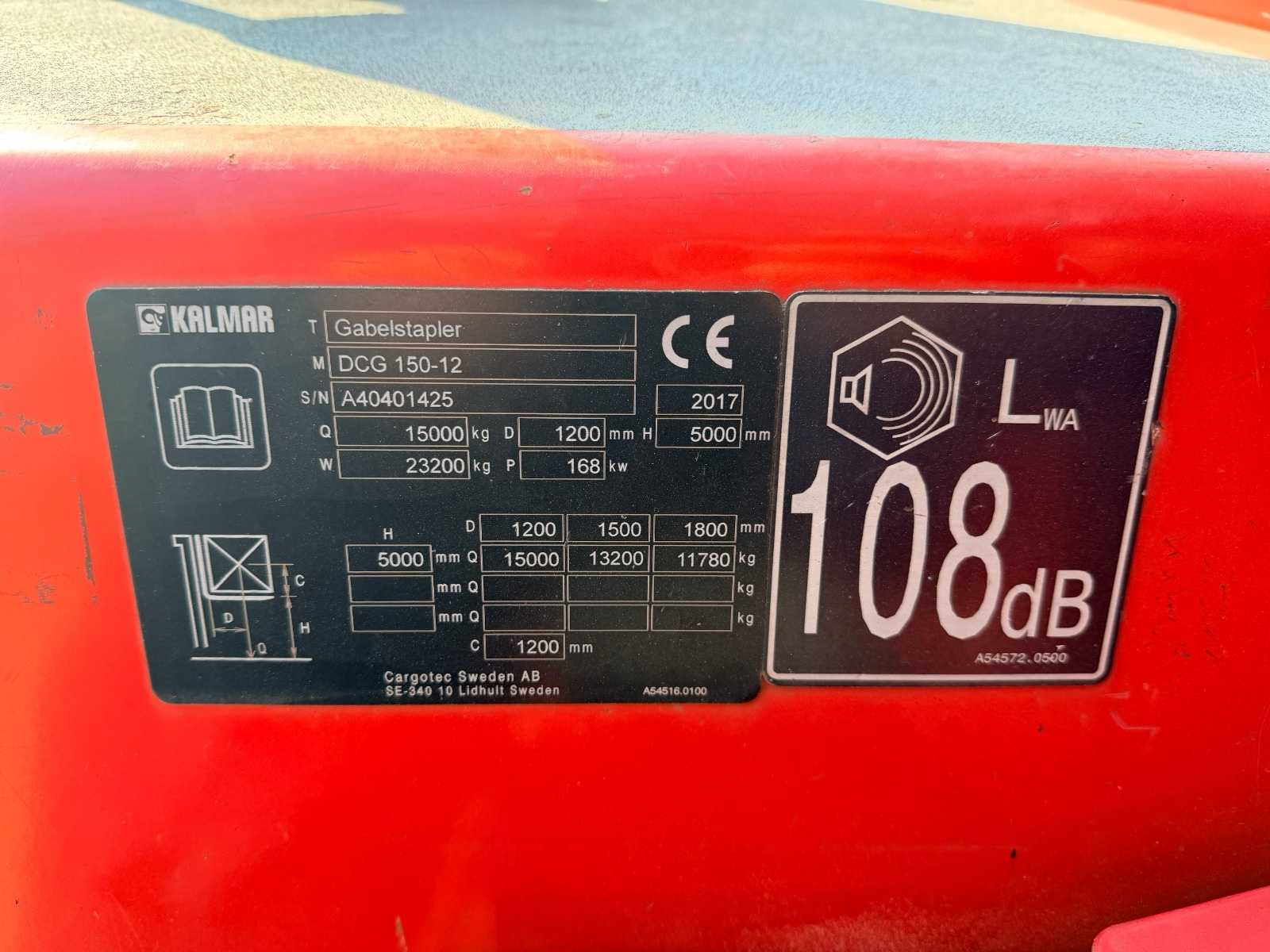 Equipped with: Kalmar DCG 150-12, 23.200 KG, dimensions: 5.20m x 2.50m x 3.40m, 2017, Cummins QSB6.7 225kW (EPA CE), max capacity: 15000kg, max lift height forks: 5mtr, fork length: 2.5mtr, Hydrodynamic Powershift, load sensing pumps, color display: – fuel level indicator, engine and transmission temperature, engine oil pressure, battery voltage, clock and date, hour meter, service time indicator, speed, engine speed (RPM), mini-lever control on armrest.