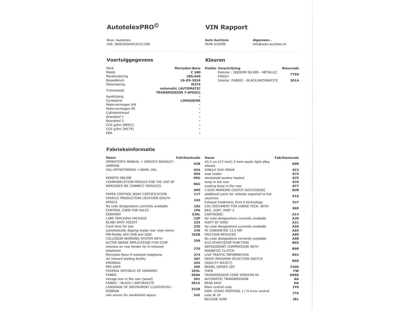| Description | If you have any questions, please email info@auto-auctions.nl Chassis number/fin: WDD2050401R151338 |