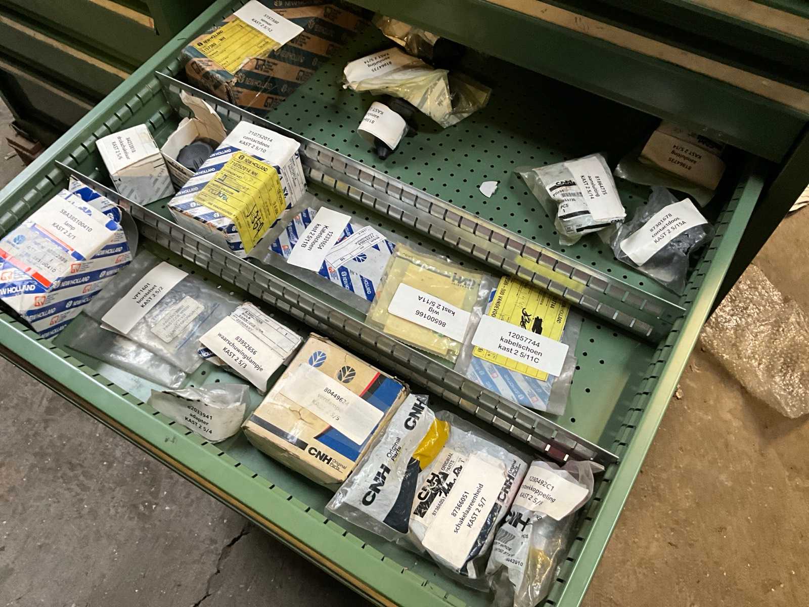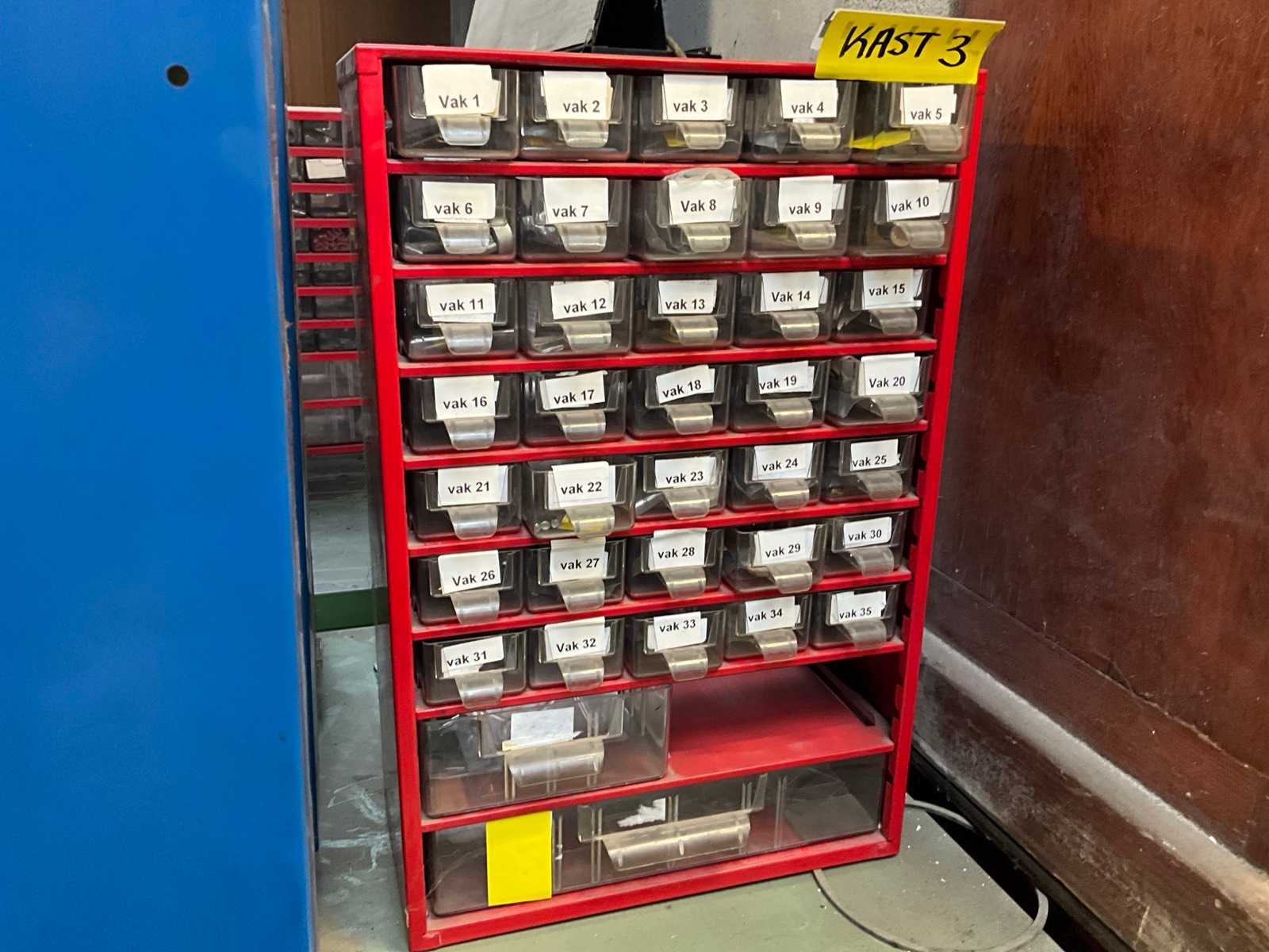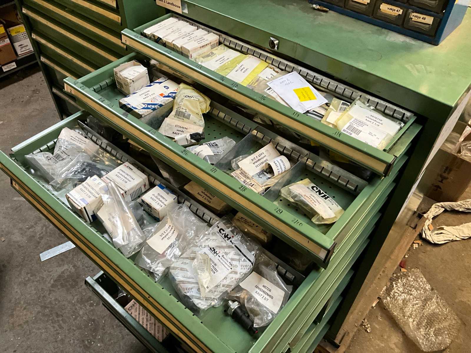 | Description | Consisting of 8 drawers with contents consisting of various original small parts such as brake cylinders, plugs and switches, sensors and battery keys, push contacts etc…+3x racks with sliders for small spare parts |