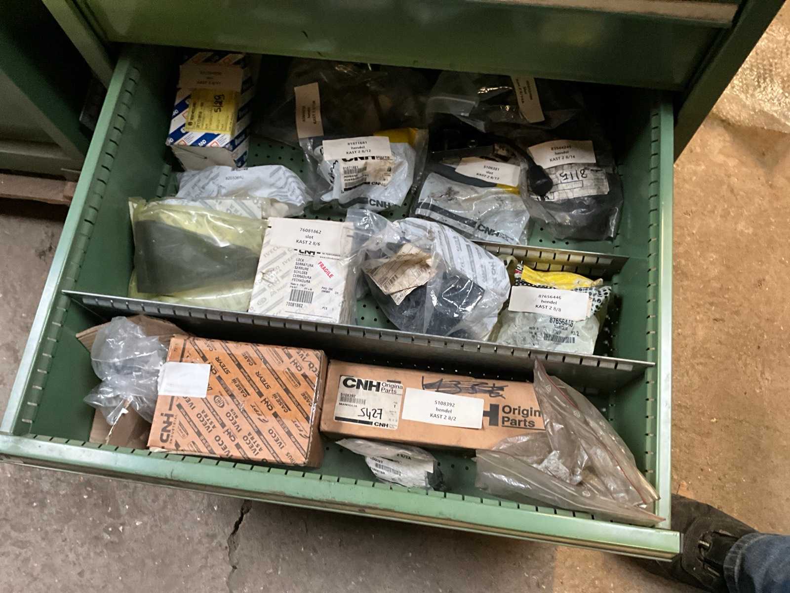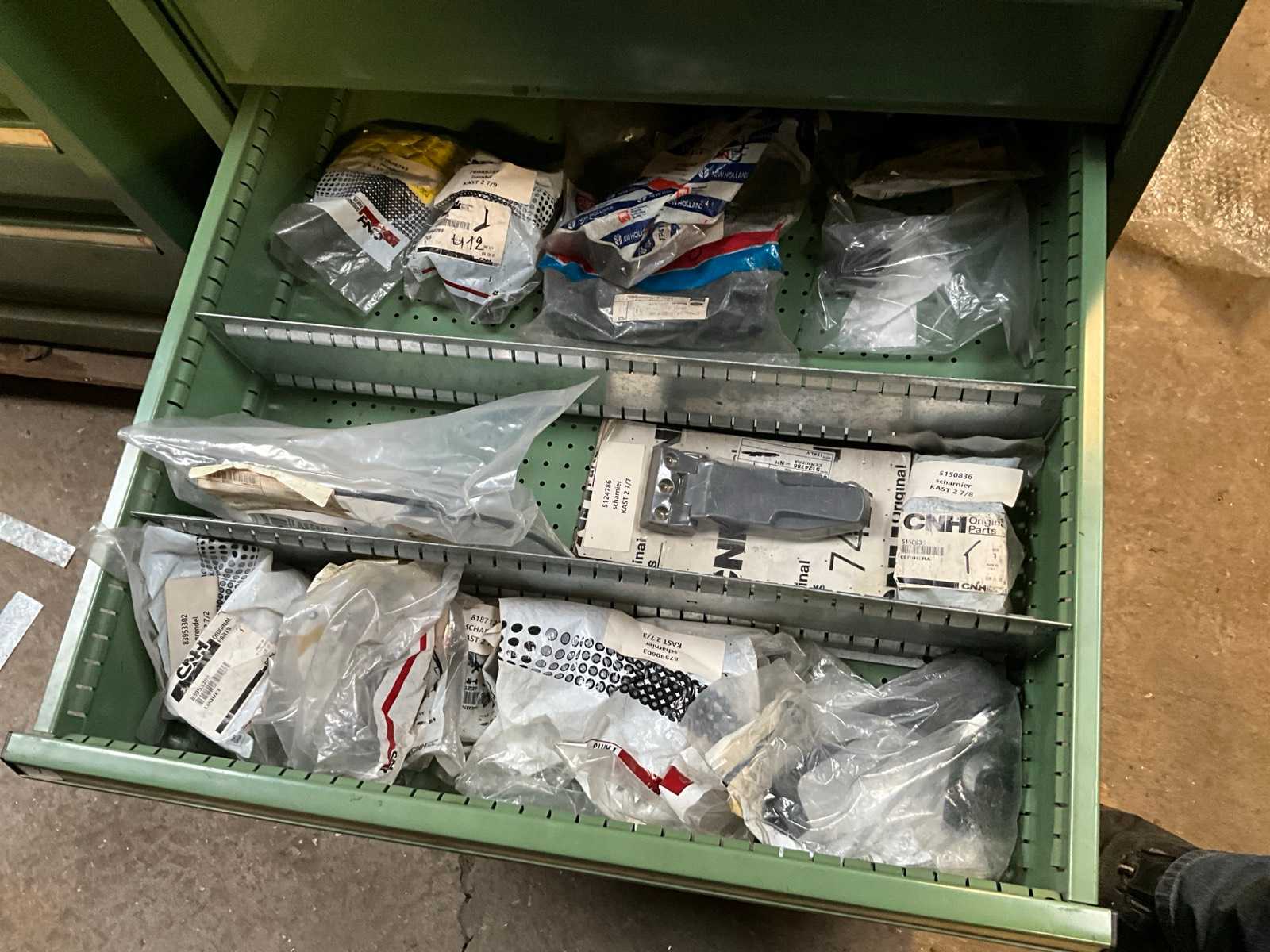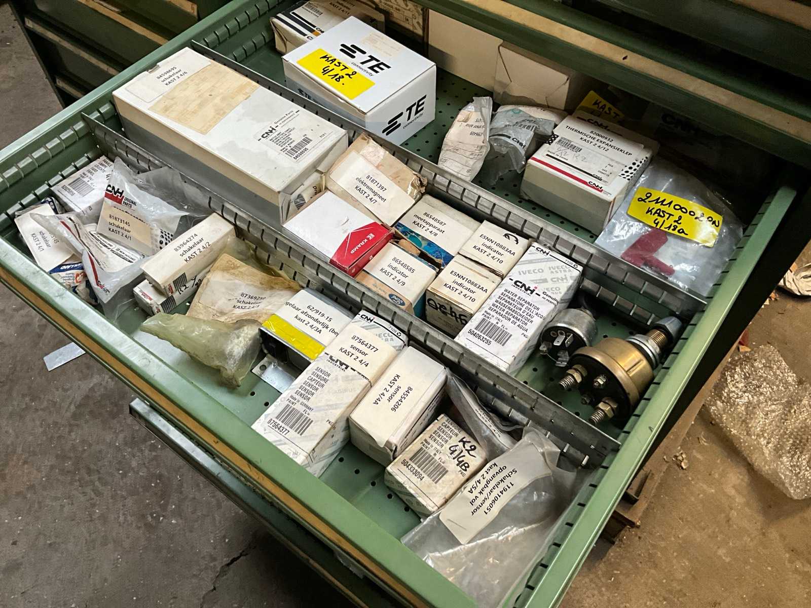 | Description | Consisting of 8 drawers with contents consisting of various original small parts such as brake cylinders, plugs and switches, sensors and battery keys, push contacts etc…+3x racks with sliders for small spare parts |