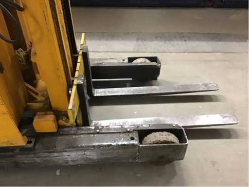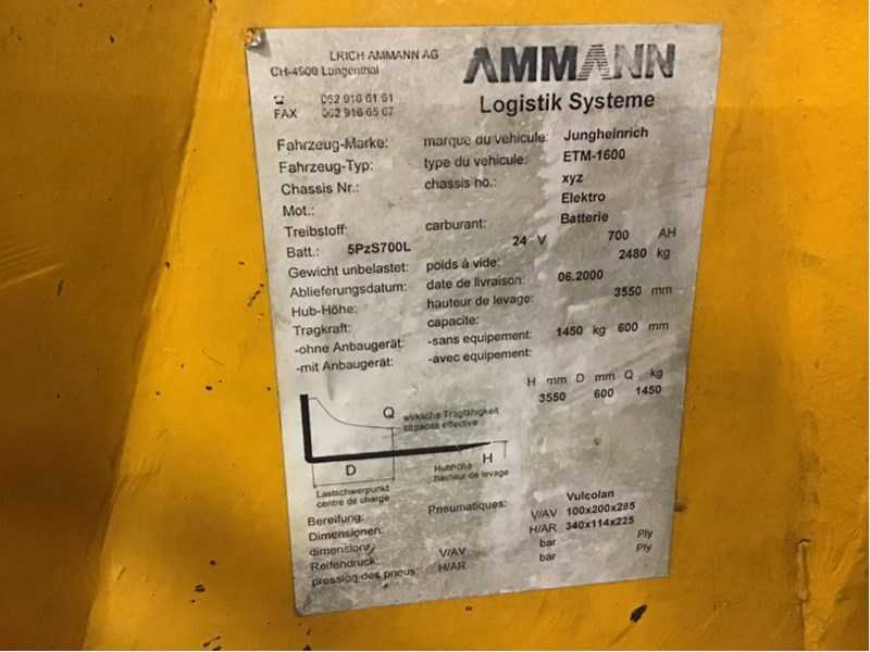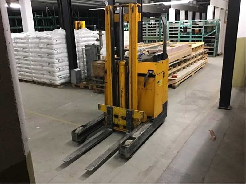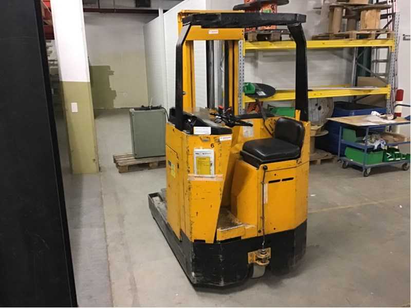| Description | Serial number: xyz ; electric: yes; Number of wheels: 3; Load capacity: 1450 kg; Lifting height: 3550 mm; Canopy height: 2130 mm; Fork length: 1150 mm; Dual mast: yes; Solid rubber tire: yes; Hours on display: 18729; Battery charger: yes; Net weight: 2480 kg; Overall dimension L: 2460 mm; Overall dimension W: 1070 mm; Overall dimension H: 2250 mm; Description: Front wheels need to be replaced, |